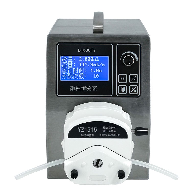 具备基本型、流量型所有功能; 304不锈钢外观,转速调节范围0.01-600rpm; 128x64图形点阵液晶显示运行参数; 支持YZ1515、YZ2515等多种泵头; 分配液量0.1mL-99.9L; 分配次数0-999次(0表示无限循环); 间隔时间1-999s; 回吸角度0-360°,防滴漏; 外控输入接口0-5V,0-10V,4-20mA,0-10kHz; RS485通讯 功率消耗<60W。 基本参数 转速调节范围:0.1-600rpm转速显示分辨率:0.1rpm(<100rpm), 1rpm(≥100rpm) 显示方式:128x64图形点阵液晶显示 分配液量:0.1mL-99.9L 分配次数:0-999次(0表示无限循环) 时间间隔:1-999秒 回吸角度:0-360° 外控输入接口:0-5V,0-10V,4-20mA,0-10kHz 通讯接口:RS485(Modbus规约) 适用电源:宽泛电压AC100-240V,50Hz/60Hz 功率消耗:<60W 工作环境:温度0-40℃,湿度<80%不结露 外形尺寸(长×宽×高):155×212×232(mm) 驱动器重量:3.5kg 防护等级:IP31 驱动器适用泵头:YZ1515、YZ2515 主要特点 ▲可设置分配的参数,便于实现自动分配灌装 ▲工作模式:流量模式和灌装模式 ▲对设定的流量进行校正,从而获得最精确的流量 ▲具备RS485通迅接口,可为用户提供通迅协议 BT600FY流量参数 YZ1515泵头:适用13# 14# 19# 16# 25# 17# 18#软管 ,单通道最大参考流量2280mL/min YZ2515泵头:适用15# 24#软管,单通道最大参考流量1600mL/min |