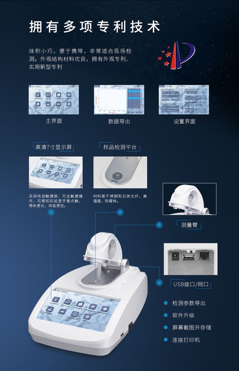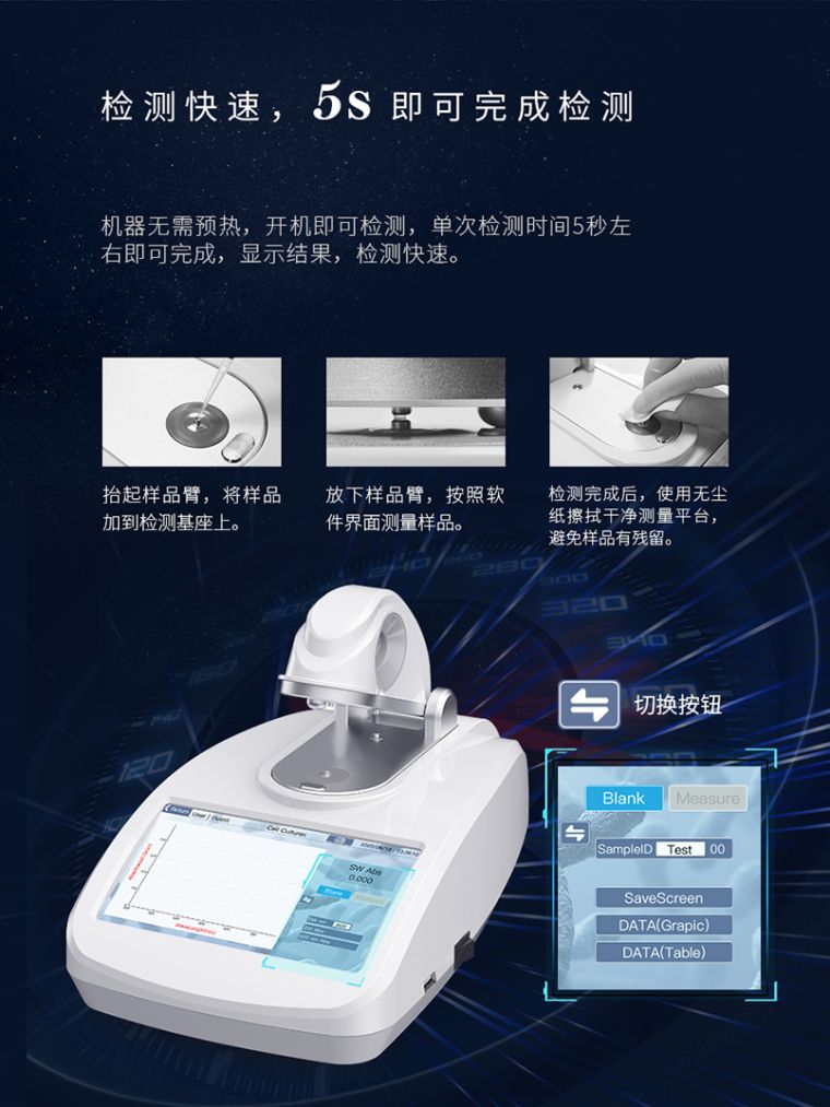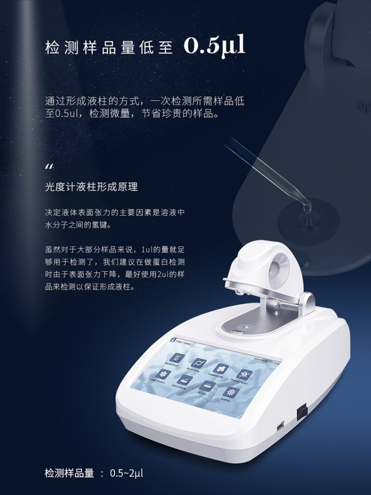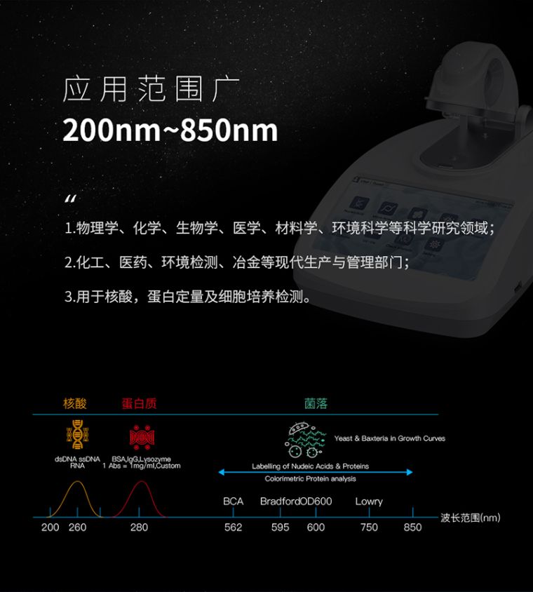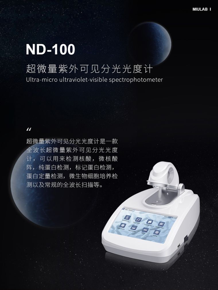 超微量紫外可见分光光度计是一款全波长超微量紫外可见分光光度计,可以用来检测核酸,微核酸阵,纯蛋白检测,标记蛋白检测,蛋白定量检测,微生物细胞培养检测以及常规的全波长扫描等。