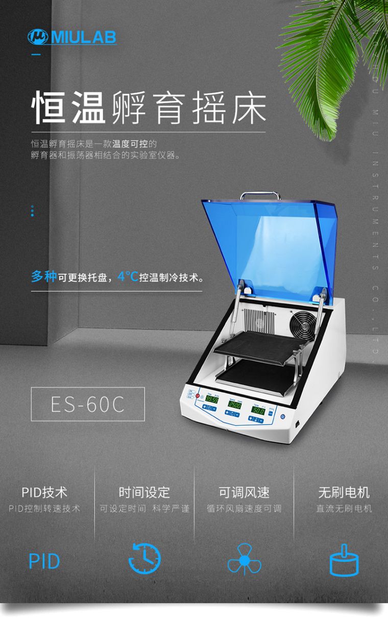 ES-60C 恒温孵育摇床是一种温度可控的孵育器和振荡器相结合的生化仪器,广泛应用于对温度和振荡频率有较高要求的细胞培养、发酵、杂交、生物化学及酶和细胞组织的研究等。可对微生物细胞与各类菌种运动和静态的培养。