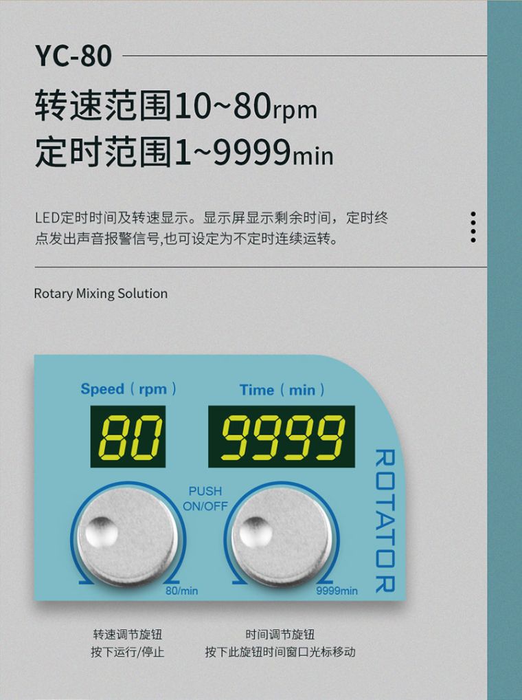 YC-40 旋转培养混合器用于样品的组织培养,萃取,测定沉降率(包括各种血样的化学测定),如:血样混合、放射免疫、葡萄糖、蛋白质、DNA、细胞、尿液、酶等湿化学分析,在生化、生物、细胞、免疫、化学、动植物分析、临床实验等诸多方面都有广泛应用。