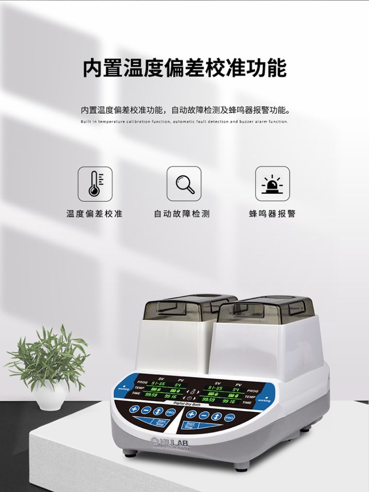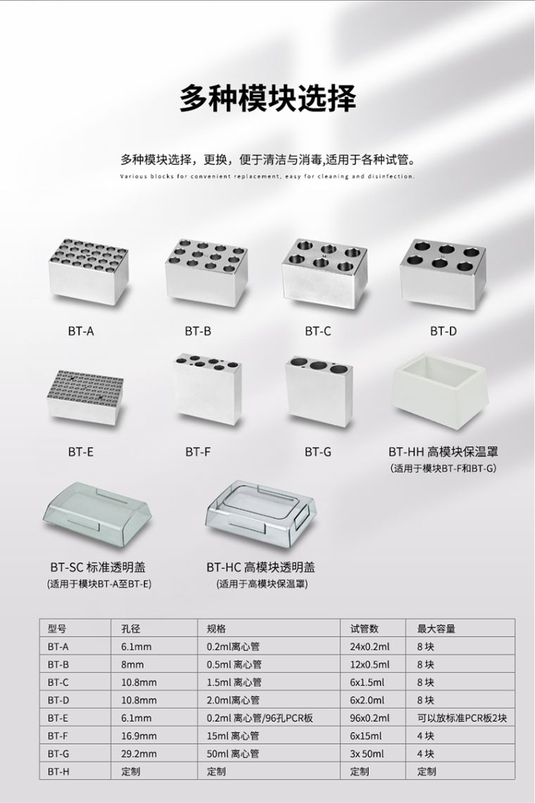 BTC-100D 双控温干式恒温器是采用微电脑控制的恒温金属浴装置, 控温精度高,制样平行性好,以代替传统的水浴装置,可广泛应用于样品的保存和反应、DNA扩增和电泳的预变性、血清凝固等。应用行业遍及医药、化工、食品安全、质检、环境等。BTC系列双控温干式恒温器是一款外观精美、性能**的新型恒温金属浴。