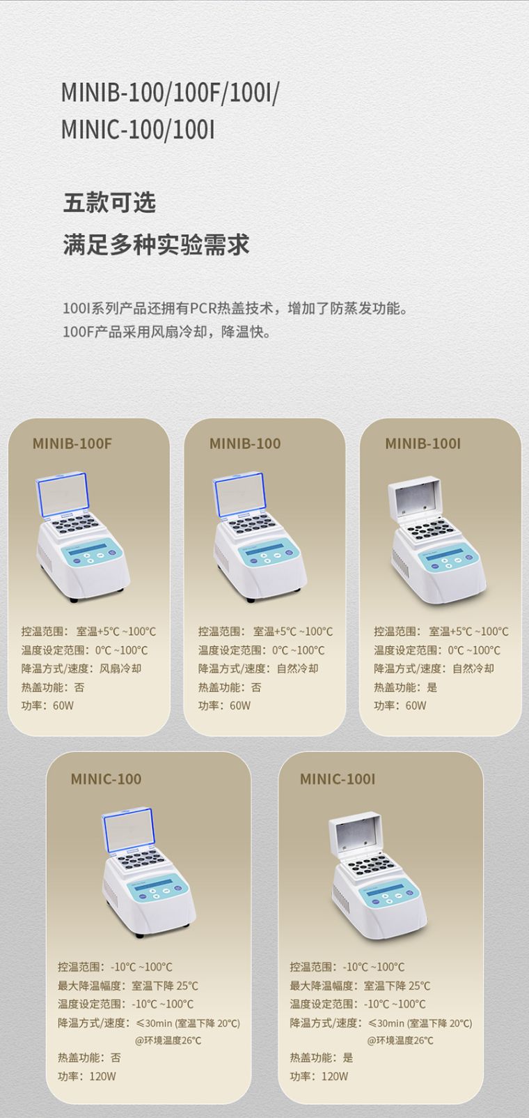 MINIC-100I迷你金属浴是采用微电脑控制半导体制冷或加热膜加热的恒温金属浴产品,是可适用于车载电源的掌上型恒温金属浴。体积特小,重量轻,移动方便,适合各种场合使用。100I系列产品还拥有PCR热盖技术,增加了防蒸发功能。100F产品采用风扇冷却,降温快。