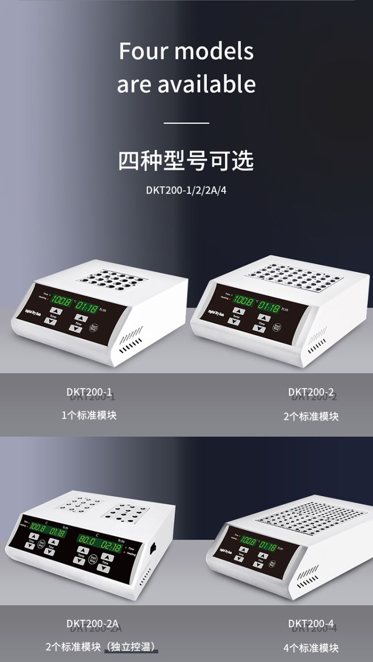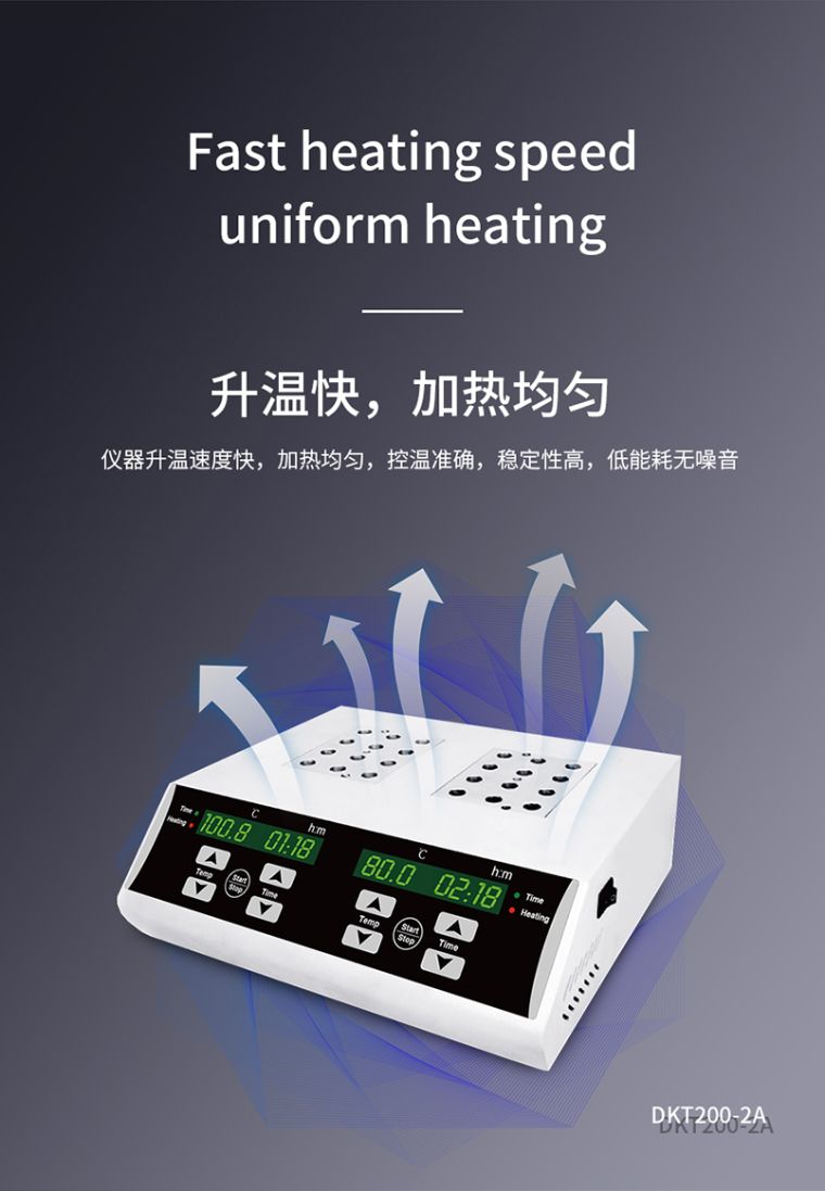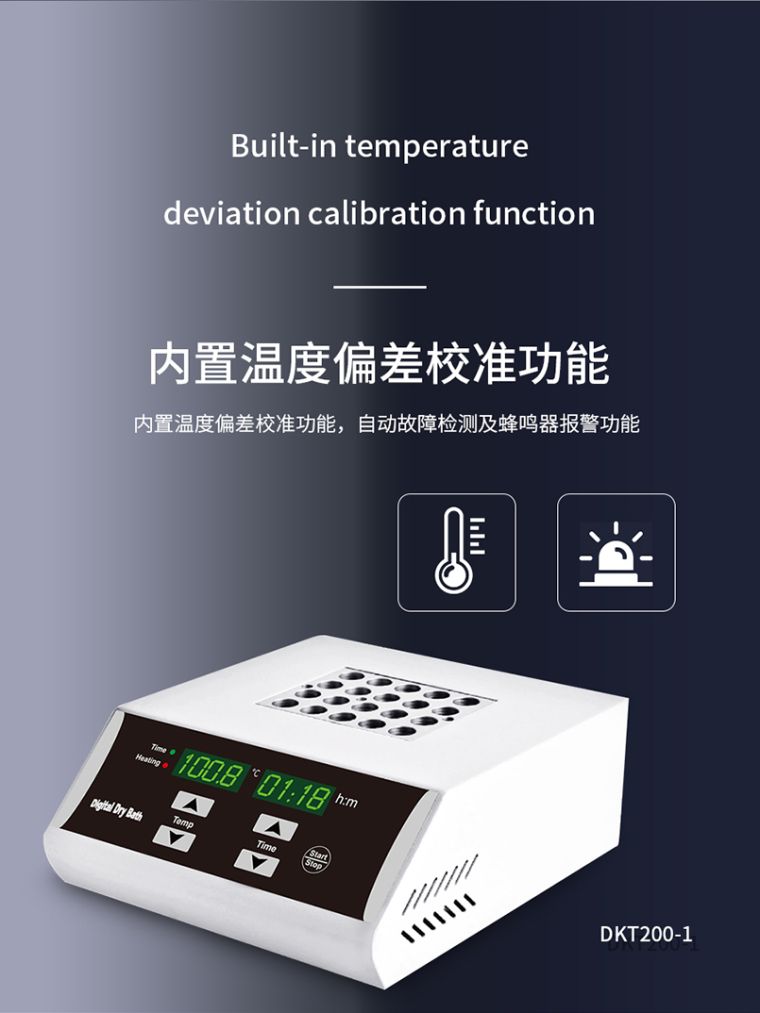 DKT200-1 恒温金属浴是采用微电脑控制的恒温金属浴装置,控温精度高,制样平行性好,以替代传统的水浴装置,可广泛应用于各种样品的培养、保存和反应,应用行业遍及医药、化工、食品安全、质检、环境等。
