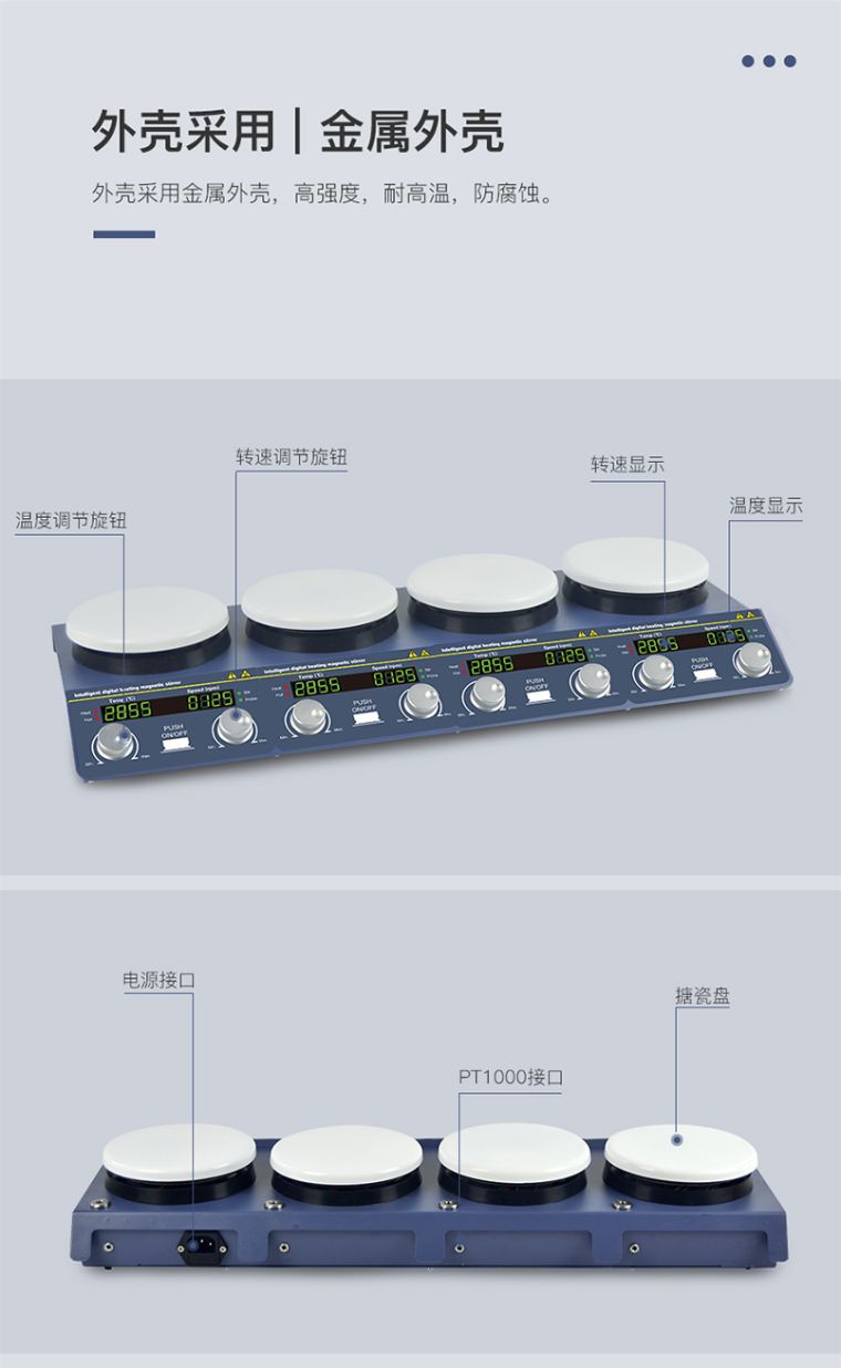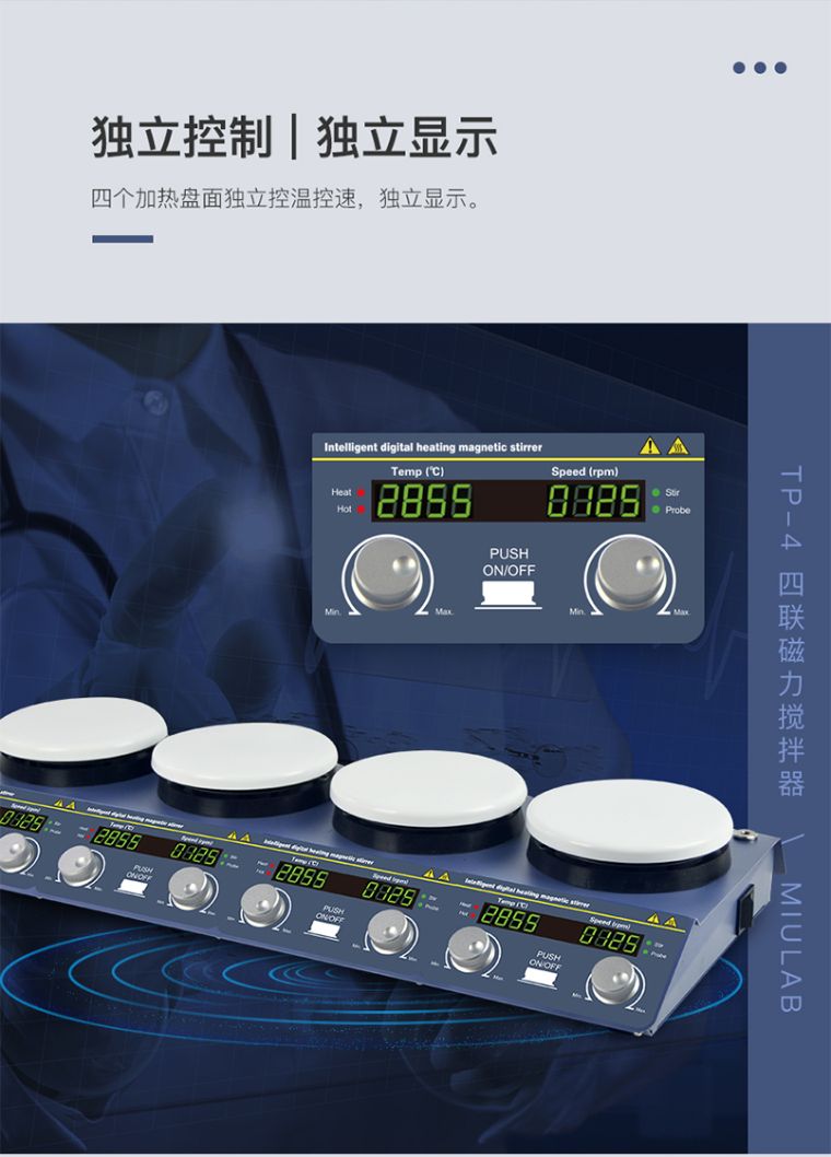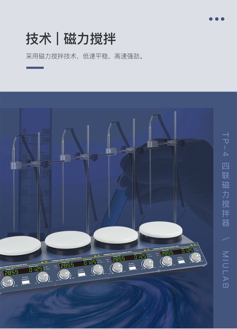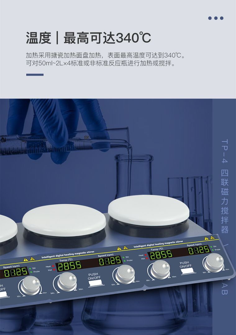 TP-4 四联磁力加热搅拌器采用特制搪瓷盘加热技术,表面最高温度可达到340℃。磁力搅拌子搅拌技术,人性化操作设计,可满足多种加热搅拌实验需求。