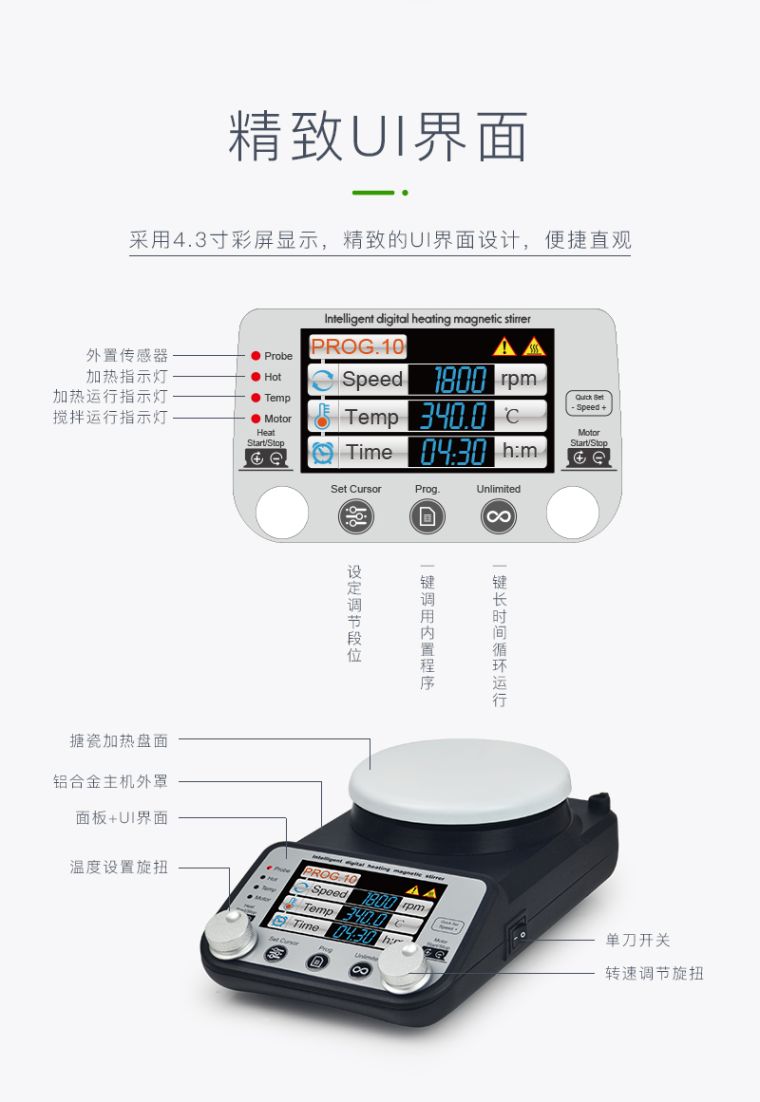 TP-350+ 磁力智能彩显加热搅拌器采用特制陶瓷盘加热技术,表面最高温度可达到340℃。磁力搅拌子搅拌技术,人性化操作设计,可满足多种加热搅拌实验需求。