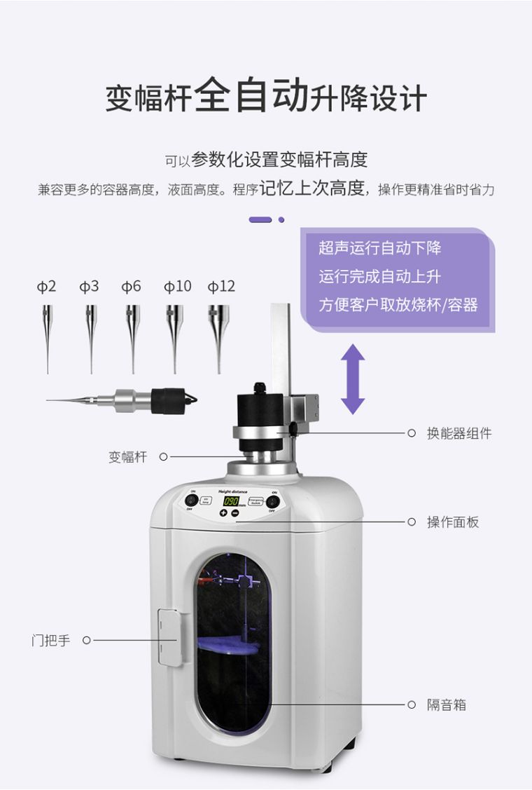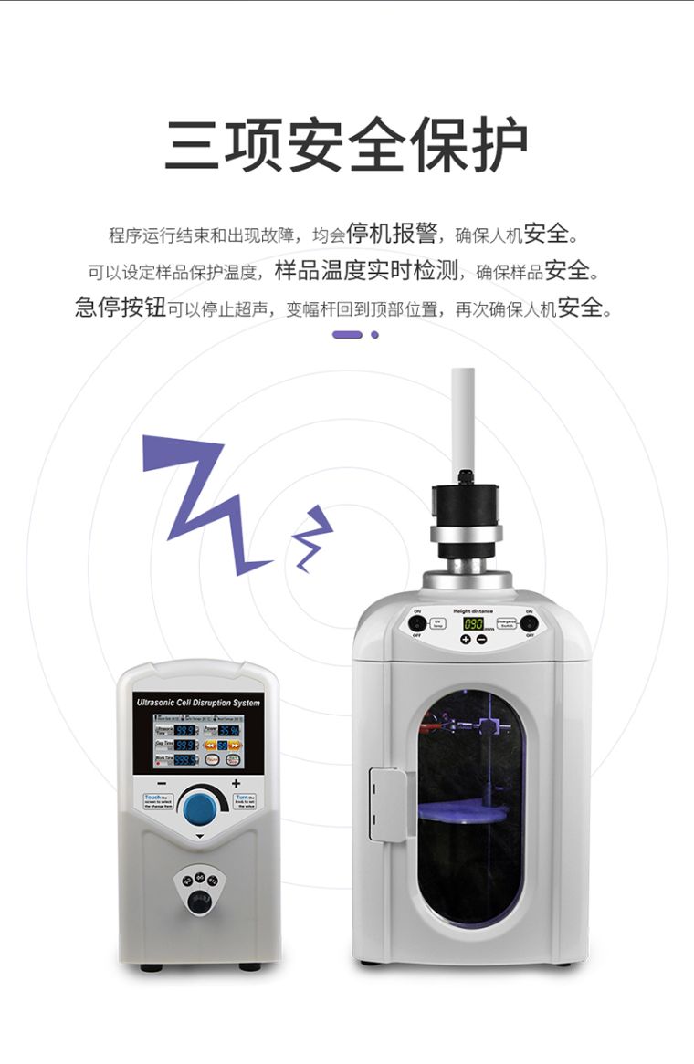 超声波细胞破碎仪,是一种利用超声波在液体中产生空化效应的多功能、多用途仪器。它能用于多种动植物、病毒、细胞、细菌及组织的破碎,同时可用来乳化、分立、匀化、提取、消泡、清洗、纳米材料的植被、分散及加速化学反应等。仪器被广泛应用于生物学、微生物学、物理学、动物学、农学、制药等领域的教学、科研、生产。