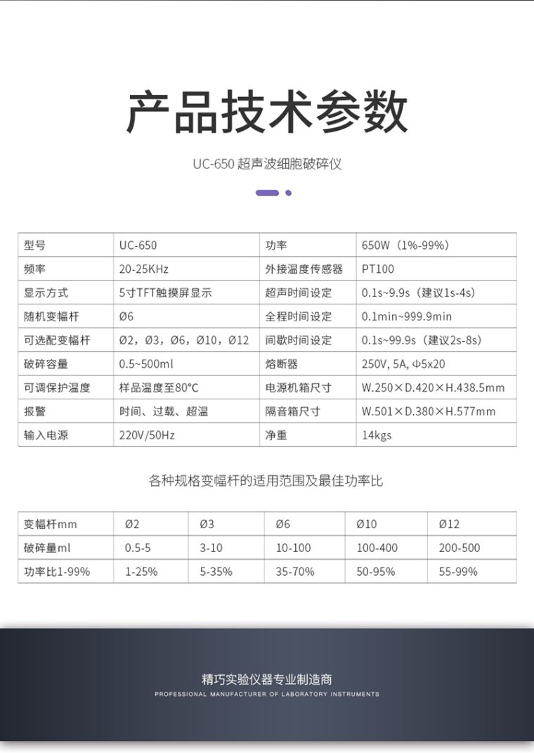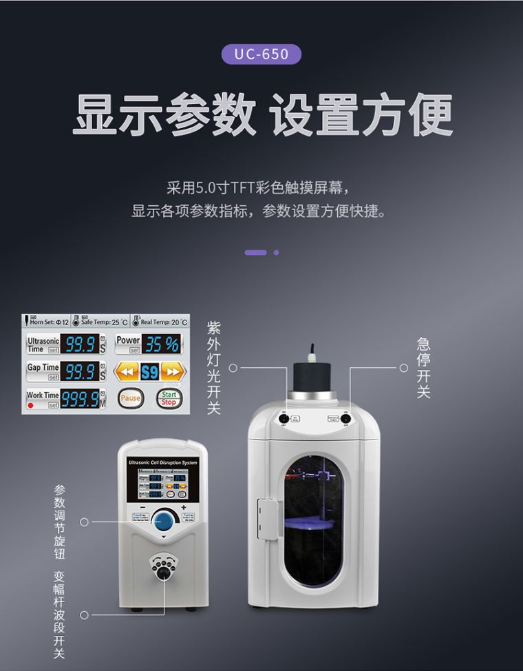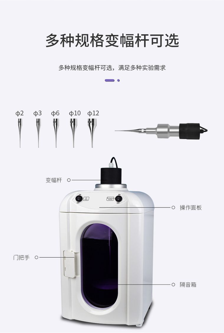 超声波细胞破碎仪,是一种利用超声波在液体中产生空化效应的多功能、多用途仪器。它能用于多种动植物、病毒、细胞、细菌及组织的破碎,同时可用来乳化、分立、匀化、提取、消泡、清洗、纳米材料的植被、分散及加速化学反应等。仪器被广泛应用于生物学、微生物学、物理学、动物学、农学、制药等领域的教学、科研、生产。