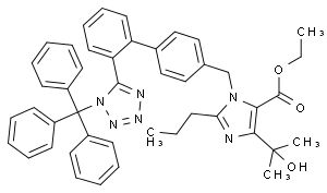 产品名称 苄唑醇酯 4-(2-羟基丙-2-基)-2-丙基-1-((2'-(1-三苯甲基-1H-四唑-5(4)-基)-[1,1'-联苯]-4-基))甲基)-1H-咪唑-5-羧酸乙酯 4-(1-羟基-1-甲基乙基)-2-丙基-1-[[2-[三苯甲基-1H-四唑-5-基][1,1-联苯]-4-基]甲基]-1H-咪唑-5-甲酸乙酯 Olmesartan Impurity G 产品介绍