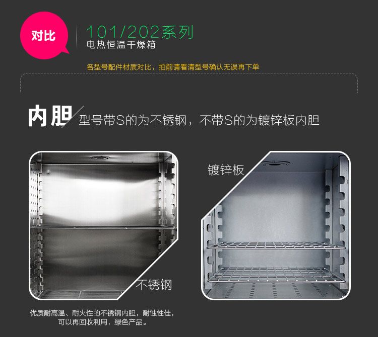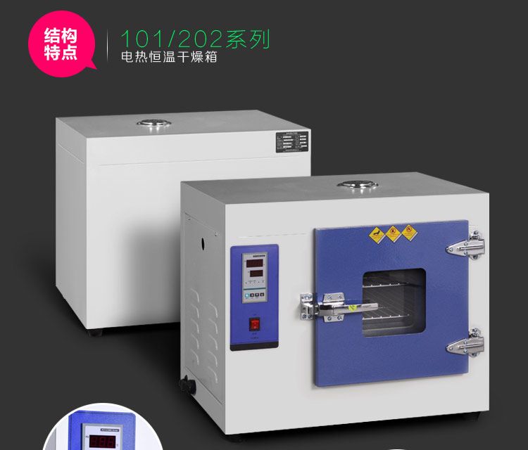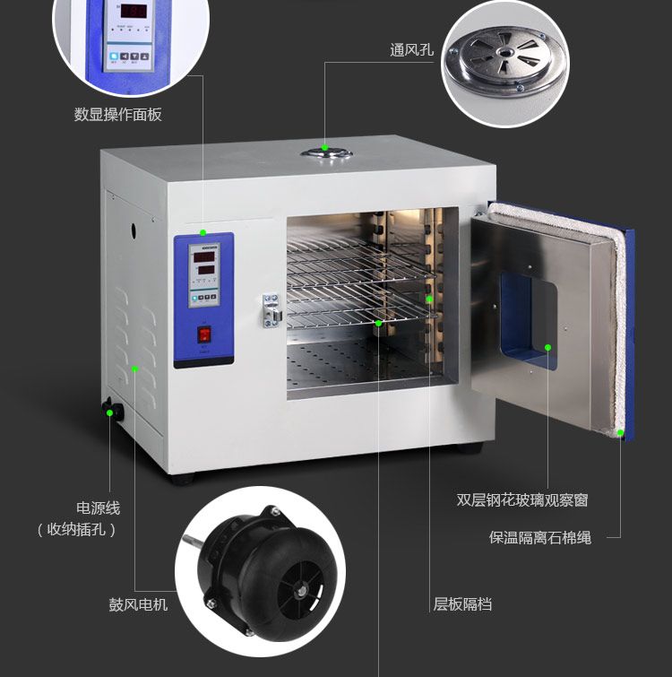 使用推荐: 适合工矿企业、基础实验室和车间常规测试,不建议长时间不间断使用。对温度均匀性要求较高和含水量较大的样品不建议使用。较贵重的样品建议务必加装独立限温控制器。 警告!易燃易爆易挥发物品严禁放入箱内加热干燥,对于高价值的物料进行加热,**加装独立限温器,设定最高温度上限,双重保险确保物料不会因箱体电子元件失效而升温过高导致损坏。 适用范围: 供工矿企业、化验室科研单位等作干燥、烘焙、热处理、加温,但不适用于挥发性、易燃、易爆等物品,以免引起爆炸。 结构特点: 1、温控器分指针式、微电脑智能PID数字显示两种; 2、外壳采用金属漆喷制,整体设计美观大方; 3、工作室内搁板高度、搁板数量均可调节,方便存取不同规格样品; 4、箱门安装有双层钢化玻璃观察窗、能清晰地观察到箱内物品。 产品规格: