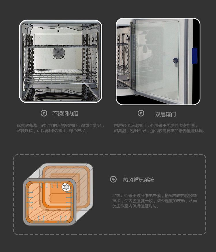 使用推荐: 现代中高级实验室推荐使用,适合对培养恒温环境有较高要求的用户。较贵重的样品建议务必加装独立限温控制器。 适用范围:适用于对微生物的培养等行业,是医疗卫生、生物、农业和科研实验的必备设备。 结构特点:1、采用精密型液晶屏微电脑智能PID控制技术,系统具有温度控制、定时、超温报警功能,带RS485微机接口; 2、标配国际品牌带散热风机,免维护,耐用度高。结合**风道设计,保证工作腔内温度均匀; 3、镜面不锈钢内胆,具有防酸碱、防腐蚀,半圆形四角易清洁,搁板上下间距可调; 4、加热元件采用碳纤维电热膜,搭配先进内腔预热技术,使内腔温度一致,减少温度波动; 产品规格: