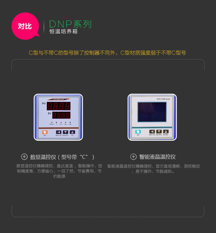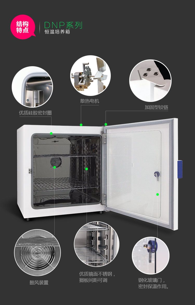 使用推荐: 现代中高级实验室推荐使用,适合对培养恒温环境有较高要求的用户。较贵重的样品建议务必加装独立限温控制器。 适用范围: 适用于对微生物的培养等行业,是医疗卫生、生物、农业和科研实验的必备设备。 结构特点: 1、采用精密型液晶屏微电脑智能PID控制技术,系统具有温度控制、定时、超温报警功能,带RS485微机接口; 2、标配国际品牌带散热风机,免维护,耐用度高。结合**风道设计,保证工作腔内温度均匀; 3、镜面不锈钢内胆,具有防酸碱、防腐蚀,半圆形四角易清洁,搁板上下间距可调; 4、加热元件采用碳纤维电热膜,搭配先进内腔预热技术,使内腔温度一致,减少温度波动; 产品规格:
