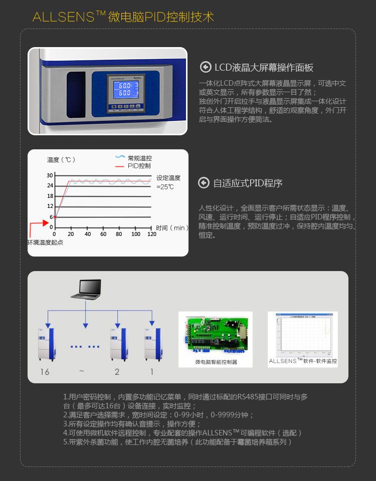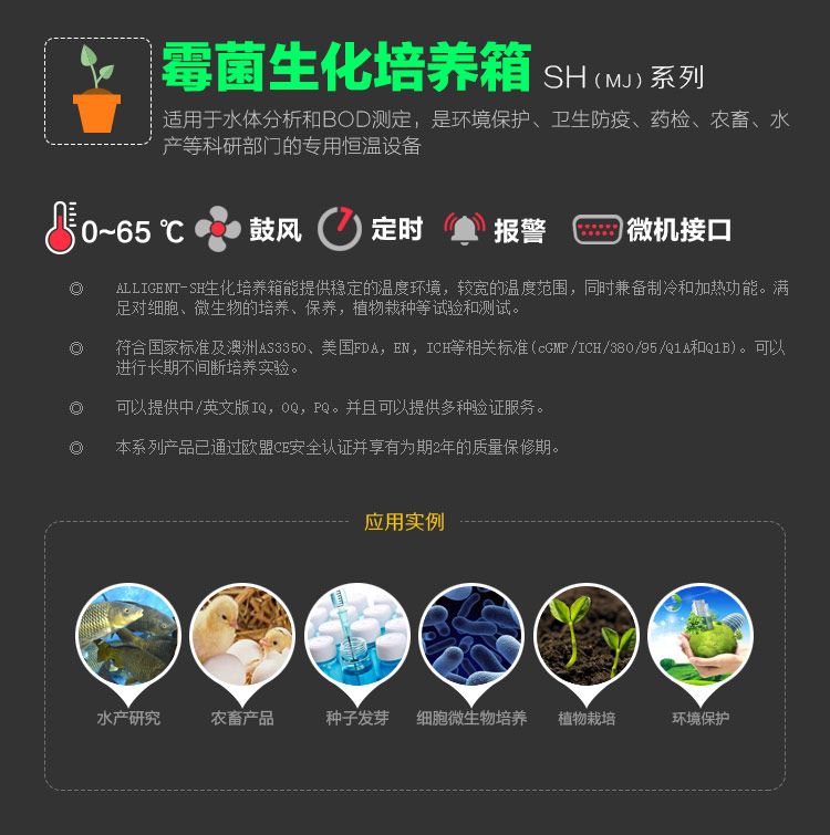 产品介绍: 适用于水体分析和BOD测定,是环境保护、卫生防疫、药检、农畜、水产等科研部门的专用恒温设备; 能提供稳定的温度环境,较宽的温度范围,同时兼备制冷和加热功能。满足对细胞、微生物的培养、保存,植物栽种等试验和测试; 符合国家标准及澳洲AS3350、美国FDA,EN,ICH等相关标准(cGMP/ICH/380/95/Q1A/和Q1B)。可以进行长期不间断培养实验及检测使用; 可以提供中/英文IQ,OQ,PQ。并且可以提供多种验证服务; 本系列产品已通过欧盟CE安全认证并享有为期2年的质量保修期。 ALLCOLD™制冷技术:国际领创的ALLCOLD™平衡式制冷,集自动除霜、多层安全保护、满足长时间运行所需,配备国际知名品牌压缩机,提倡环保、高效。节能; 自动化霜功能:平衡式制冷方案,以**的快速热泵化霜技术未技术基础,客户可以进行连续不间断的工作使用状态;有效解决因蒸发器连续运行产生的结霜问题; 制冷量大小手动控制系统,可满足客户极端的应用环境; 原装进口杜邦DuPont™SUVA®R134a环保制冷剂,令世界更洁净,提供优质的客户使用环境; 节约能耗设计,使得客户使用成本减少。 ALLFLOWTM气流循环系统:强制对流ALLFLOWTM气流循环系统,保证开门后温度恢复的最短化。配合国际知名品牌带散热风机(免维护,耐用度高),令实验和培养效果达到理想的程度。 ALLFLOWTM气流循环系统充分保证了工作腔内温度的连续稳定性,风速大小可调节,带风机开关功能。在达到客户设定的温度时,给予了样品烘培/培养的**环境。 ALLSENSTM微电脑PID控制技术:一体化LCD点阵式大屏幕液晶显示屏,可选择中文或英文显示,所有参数显示一目了然。 人性化设计,全面显示客户所需状态显示:温度、风速、运行时间、运行停止。 自适应式PID程度控制,精确控制温度,预防温度过冲,保持腔内温度均匀、恒定。 用户密码控制,内置多功能记忆菜单,同时通过标配的RS485接口可同时与多台(最多可达16台)设备连接,实时监控。 满足客户选择需求,宽时间设定:0~99小时,0~9999分钟。 所有设定操作均有确认音提示,操作方便。 可使用微机软件远程控制,专业配套的操作ALLSENSTM可编程软件(选配)。 精良的原装进口温度传感部件:原装进口工业级PT100温度传感器,对温度出现阶跃变化时响应时间快速,自热温度影响小。 高效隔离设计:双层隔离隔热保温技术,保证因内外温差造成的功能耗损,全面支持环保理念,节约能源; 内隔离门设计技术,充分考虑客户在观察腔内样品时。保证内腔温度的一致性。 符合人体工程学的结构设计:现代实验室经典产品颜色搭配,国际流行设计,圆弧形设计理念令实验室增加亮点,增加操作舒适性; 外门与液晶控制面板一体化设计,符合人体工程学结构,舒适的观察角度,外门开启与界面操作方便简洁; 活动式网状隔板,间隔和数量可根据客户需求进行多种间距的调整,最大容量满足各式实验、培养物品; 人性化立式经典结构设计,工作内腔最大化使用; 双重门设计(配备于培养箱系列),即时掌控内腔样品状态,同时令保温性能更佳。 清洁便利:内胆洁净便于清洁的理念体现,最少的拼接设计方便清洁和维护; 活动可抽取多层搁板设计,较少的腔体内金属配件易于清洁。 维护便捷:液晶微电控制器具有诊断功能,实际显示各种工作状态贮存包括历史运行及温度数据; 电器控制元器件主控与控制面板分离,均安装在箱体后部,便于设备的维护和保养。 安全高效的保护理念:多重过温保护功能,声光报警提醒客户; 自动双重过温安全保护功能; 所有电子元器件均通过UL认证; 所有过温保护装置设计均符合德国DIN 12880 Class 3.1标准 产品规格: