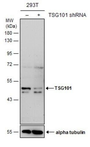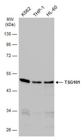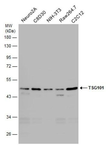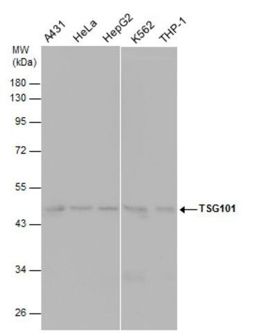 Monoclonal Anti-TSG101 antibody has been used in western blotting and immunoprecipitation (IP) analyses.