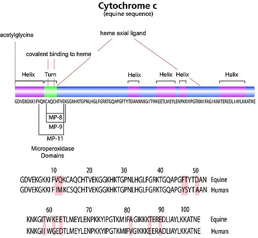 马的细胞色素c经过H2O2和UV 处理后的特异性位点和氧化程度已经过表征。研究表明这些位点可能可用作细胞内氧化环境的生物标记。