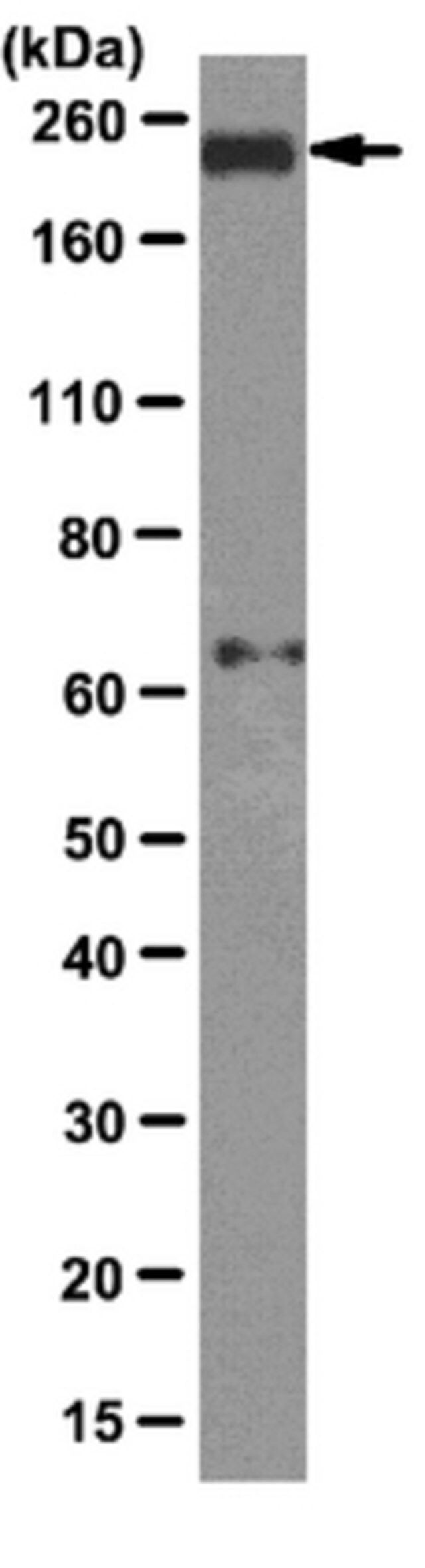 ~220 kDa observed. The calculated molecular weight of this protein is 208 kDa, but can be observed at ~220 kDa due to high glycosylation. An uncharacterized band appears at ~65 kDa in some lysates.