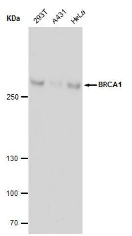 BRCA1-17F8 recognizes full-length BRCA1, a 220kDa nuclear phosphoprotein, and does not recognize the Aexon 11 splice variant. In a high proportion of breast and ovarian cancer cell lines, BRCA1 aberrantly mislocates to the cytoplasm. Its usefulness to monitor functional inactivation of BRCA1 in sporadic breast cancers is under active investigation.