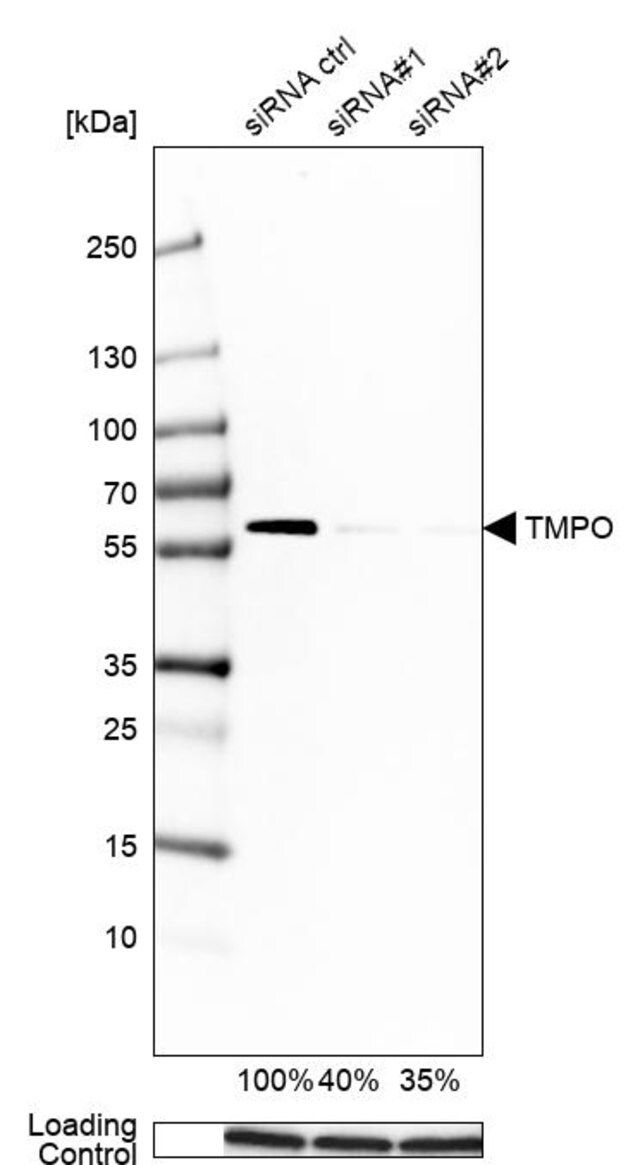 TMPO (thymopoietin) gene is mapped to human chromosome 12q22. Alternate splicing of the mRNA results in isoforms α (75kDa), β (51kDa), and γ (39kDa), which are related nuclear proteins. The gene consists of eight exons spanning a length of ∼35kb. Exon 4 is spliced into α mRNA, which encodes a putative basic nuclear localization motif. Exon 8 encodes a hydrophobic putative membrane-spanning domain that targets β and γ isoforms to the nuclear membrane
