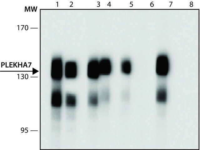 Monoclonal Anti-PLEKHA7 (mouse IgG2a isotype) is derived from the hybridoma PLK7 produced by the fusion of mouse myeloma cells and splenocytes from BALB/c mice immunized with a synthetic peptide corresponding to a sequence at the N-terminal region of human PLEKHA7, conjugated to KLH. PLEKHA7 contains WW (rsp5-domain), PH (pleckstrin homology), and CC (coiled-coil) domains.