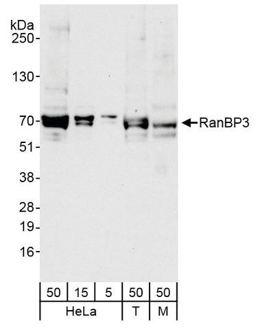 Ran binding protein 3 (RanBP3) is a Ran (ras-related nuclear protein) binding protein and a component of a nuclear transport complex that functions to export proteins out of the nucleus. RanBP3 binds the nucleocytoplasmic transport receptor, CRM1, and facilitates the export of CRM1 substrates. Recently it has been shown that RanBP3 function is regulated by the Ras/ERK/RSK and PI3K/Akt signaling pathway. This finding has provided a link between nuclear transport, cell signaling, and cell fate.