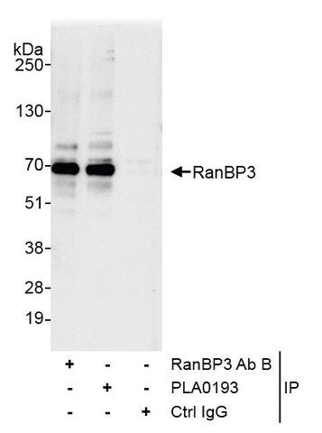 The epitope recognized by PLA0193 maps to a region between residue 150 and 200 of human RAN binding protein 3 using the numbering given in entry NP_015561.1 (GeneID 8498).