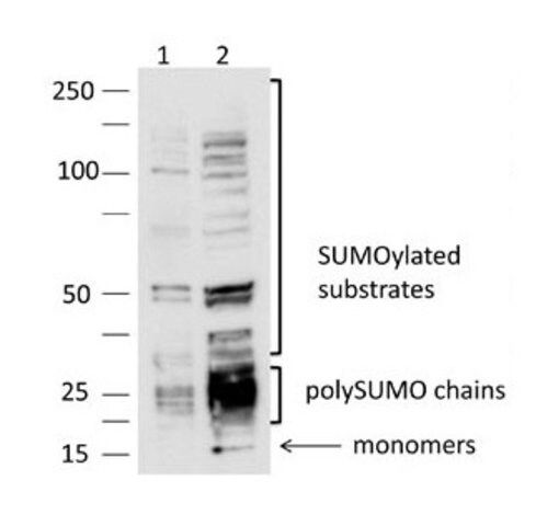Sumo3 is a ubiquitin-like protein which can be covalently attached to target lysines either as a monomer or as a lysine-linked polymer. It does not seem to be involved in protein degradation and may function as an antagonist of ubiquitin in the degradation process. It plays a role in a number of cellular processes such as nuclear transport, DNA replication and repair, mitosis and signal transduction. Covalent attachment to its substrates requires prior activation by the E1 complex SAE1-SAE2 and linkage to the E2 enzyme UBE2I, and can be promoted by an E3 ligase such as PIAS1-4, RANBP2 or CBX4.
