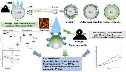 近日,中国农业科学院农业资源与农业区划研究所肥料及施肥技术创新团队,针对聚氨酯包膜控释肥料膜层疏水性不佳导致养分控释期短等行业痛点,成功研发出一种纳米SiO₂改性超疏水聚氨酯包膜控释尿素。该新型肥料膜层水接触角(WCA)高达165.44°,控释期最长可达61天,相关研究成果已发表于《ACS Omega》期刊(JCR Q1, IF 4.3)。 包膜控释肥料作为现代农业高效施肥的重要载体,可调控养分释放,实现与作物养分需求的动态匹配。在一次性施肥模式下,其不仅能有效减少氮素流失,保障作物稳产高产,还能优化农田氮素管理,降低农户劳动投入,实现环境效益与经济效益的协同统一。然而,在实际生产应用中,聚氨酯包膜肥料普遍存在膜层疏水性能较差、控释期偏短的短板,难以精准匹配作物全生育期的养分需求,制约了其推广应用。因此,将纳米技术与包膜控释技术相结合,延长肥料控释期、实现养分精准控释,已成为当前控释肥料领域的核心技术突破方向。纳米SiO₂因来源广泛、成本低廉,且具备极高的化学稳定性、良好的生物相容性、低毒性,同时拥有巨大的比表面积和极强的表面吸附与反应活性,成为提升包膜膜层疏水性的最优改性材料。 本研究以不同粒径的SiO₂为核心原料,首先采用1H,1H,2H,2H-全氟癸基三甲氧基硅烷(FAS),通过“先醇解、再缩合”的两步法,将其接枝到SiO₂表面,有效提升了SiO₂的分散性,成功制备出FAS-SiO₂改性超疏水材料。其次,系统研究了表面涂布法、共混法、外层共混法三种工艺对超疏水纳米SiO₂包膜尿素膜层表面能、微观形貌、粗糙度、水接触角等性能以及肥料控释期的影响,指出表面涂布法能最大限度发挥FAS-SiO₂的超疏水特性,可显著降低膜层表面能、构建稳定的微/纳超疏水结构,膜层水接触角高达158.24°,且膜层稳定性表现优异,成功解决了纳米涂层易脱落的关键技术难题。最后,研究发现不同粒径的FAS-SiO₂对膜层性能及控释期具有显著影响,其中以20 nm FAS-SiO₂改性的聚氨酯包膜肥料综合性能最佳,与普通聚氨酯包膜尿素相比,控释期可延长21天。该研究成果不仅为纳米控释肥料的研发与应用提供了坚实的理论支撑,也为加快包膜肥料产业升级、推动产品迭代更新提供了重要的技术保障,对促进现代农业绿色高效发展具有重要意义。 中国农业科学院农业资源与农业区划研究所硕士研究生赵森为论文第一作者,李娟研究员和杨相东研究员为论文共同通讯作者。本研究得到北方干旱半干旱耕地高效利用全国重点实验室、“十四五”国家重点研发计划项目(2024YFD1700102)、国家自然科学基金项目(32372819)和中央级公益性科研院所基本科研业务费所级统筹项目(1610132023005)等项目共同资助。