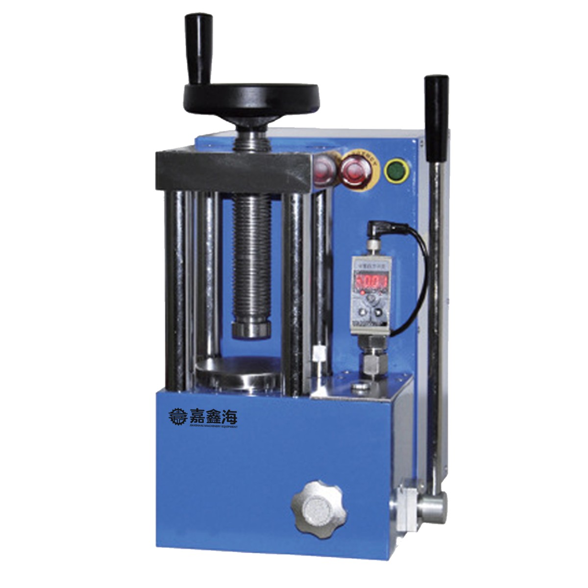 电动压片机是天津嘉鑫海为适应市场需求而研制的新一代油压压片机,该系列油压机进行了全面改进升级,实现了手动+电动两用功能;采用进口压力传感器密封结构,油池、油缸、主板、活塞 无密封一体式技术,密封效果好,解决了漏油现象;具有体积小,重量轻,工作空间大,压力稳定性更可靠等优势特点;而且压片机日后的清洁调试过程也更加便捷,方便了客户进行仪器维护。 压片机操作步骤: 1、将模具组装好,放入压片机内并拧紧丝杠。 2、按下mode键,屏幕显示LocP。 3、再按▲键,设置0001后再按一下mode键,进入控制菜单。 4、选择RL1F后,再按mode键进入设置压力停止值。 5、选择RL1H后,按mode键进入,设置低于多大压力自动补压。 6、移动到END菜单,再按mode键,退出设置并保存。 7、拧紧放油阀杆,准备加压。 8、按下绿色启动按钮,压片机开始加压。 9、当压力到达所设定的压力后,系统自动停机。 10、如果需要精确控制压力,可以通过手动加压装置进行控制。 11、按下绿色启动按钮,将压片机电源关闭。 12、松开放油阀杆,将压力释放,并去取出模具。