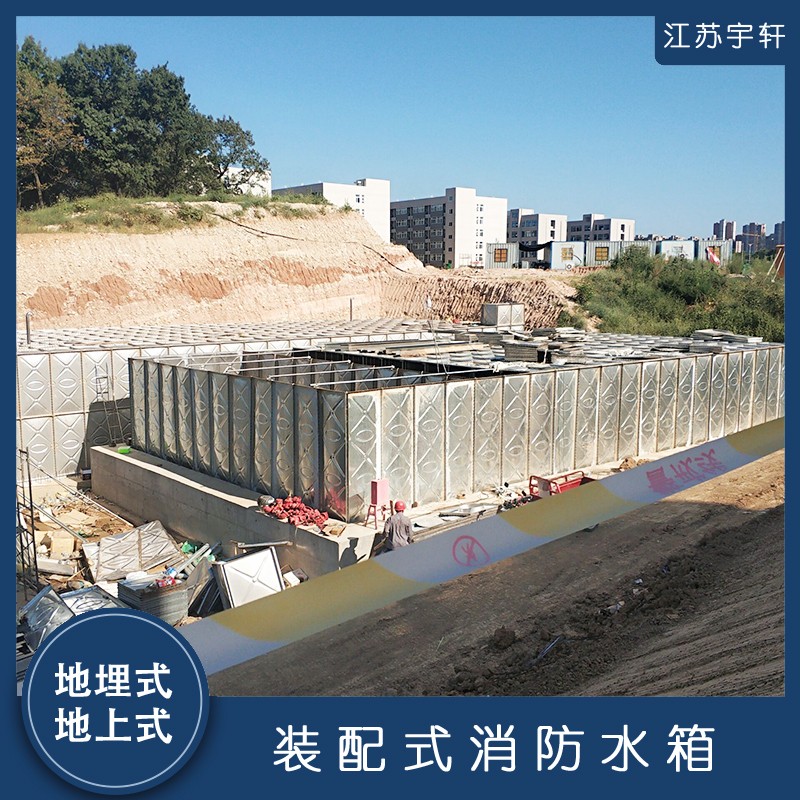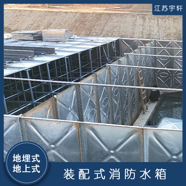 地埋式消防水箱 地埋式BDF消防水箱由BDF单板(3mm镀锌钢板和0.4mmSUS304不锈钢复合模压而成的复合钢板)密封材料、金属构件及配管系统组合拼装而成,具有以下特点: 1、组合大小任意性,可根据用户需要组装0.125-2000立方米水箱。 2、水箱密封采用专门研制的定型产品-密封带,该密封带具有耐水、耐氧化密封性能好等优点,使用寿命达50年以上。 3、水箱卫生条件好,同水接触部分采用不锈钢板材模压成形。