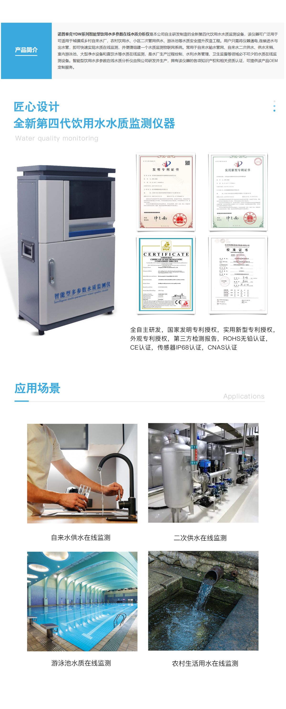 常用于自来水输水管网、自来水二次供水、供水末梢、室内游泳池、大型净水仪和直饮水等水质在线监测,是水厂生产过程控制、水利水务管理、卫生监督等领域常用的水质在线监测仪。诺普泰克直饮水水质在线监测仪由我公司研发并生产,拥有该仪器的各项知识产权和相关资质认证,可提供该产品OEM定制服务。