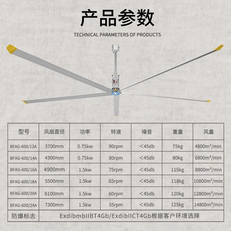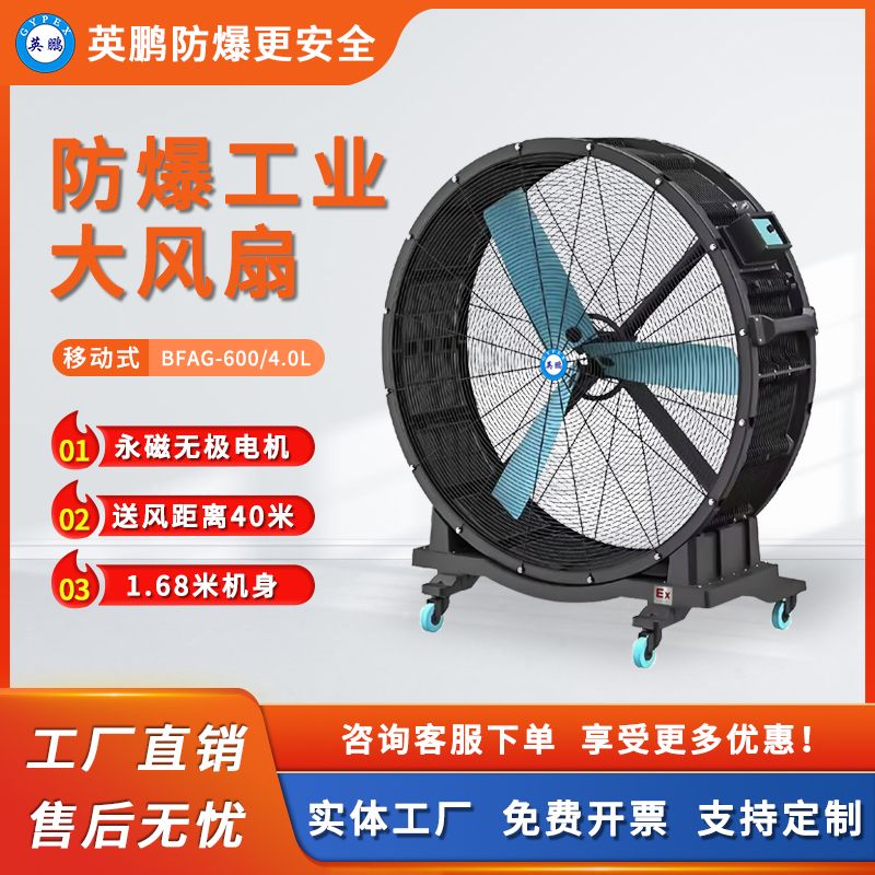 欢迎选购我们的防爆工业大风扇,为您带来满意的使用体验!本产品适用于石油、化工、冶金、医药、纺织、食品、生物工程、制药、危化品仓库、涂料车间、医疗、实验室、航天航空工程等可放置于爆炸性环境中,有防爆要求的场所。我们的产品以突出的防爆功能为卖点,确保您在工业环境中的安全。 简单的开启或关闭按钮设计,让操作更加便捷,让您能够轻松掌控风扇的运行状态,它具有可调节速度控制的功能,您可以根据实际需求自由调整风速,为您提供个性化的使用体验。不论是需要强劲的风力还是温柔的微风,我们都能满足您的要求。 另外,我们的大风扇安装简易,无需复杂的工具即可轻松完成。我们注重用户的实际需求,为您节省时间和精力,让您能够快速开始使用。同时,我们的风扇颜色美观新颖,简约时尚的外观设计,能够为您的工业环境增添一份亮丽的色彩。 我们还提供自定义颜色的服务,根据您的个性化需求,为您量身定制风扇。无论是企业标志色还是个人喜好,我们都能满足您的要求,让您的风扇与众不同。 选择我们的防爆工业大风扇,您将享受到安全、方便、个性化的使用体验。我们致力于为您提供满意的产品和服务,让您的工作环境更加舒适、安全。不论您身处何地,都能感受到我们产品的优质。选购我们的大风扇,就是为您的安全和舒适保驾护航!