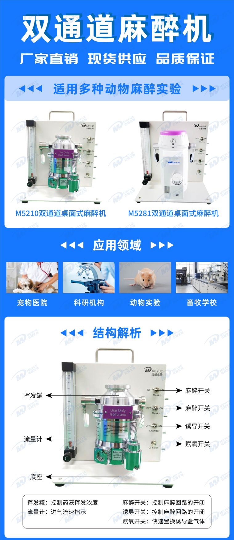 M5210双通道桌面式麻醉机,动物实验必备的基础麻醉设备,适用于大小鼠、犬、猫、猪、猴、啮齿类、爬行类以及鸟类等多种动物几乎所有手术,配套我司相关的气源、诱导盒、麻醉面罩和气体回收器,提供全套小动物气体麻醉解决方案,操作简单,安全可靠。