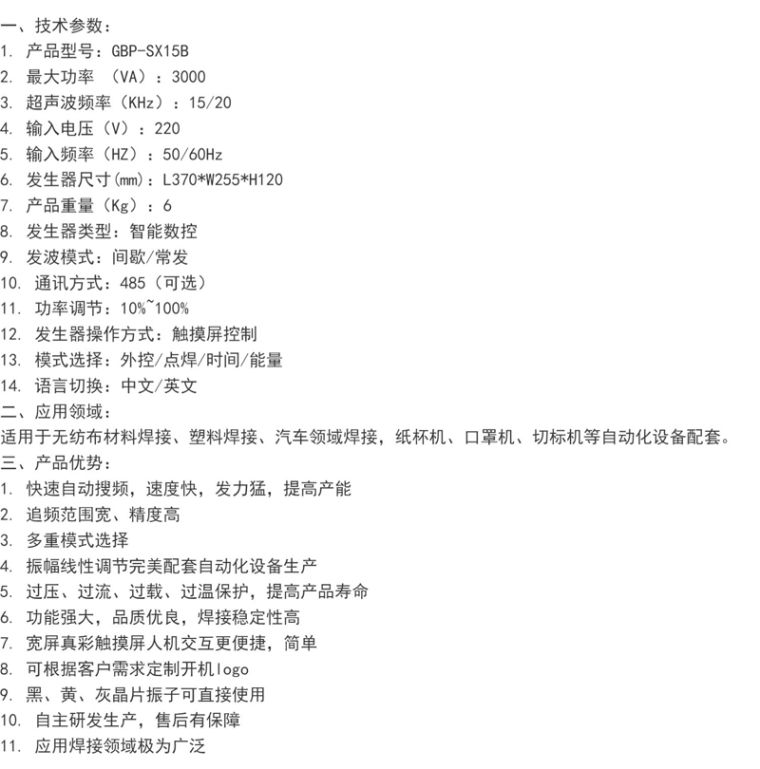 超声波焊接原理是由智能数控超声波发生器将输入宽电压范围的工频交流电整流滤波转换为约310V的直流电,经过斩波成特定的高频交流电,经过高频变压器将信号放大到几千伏高压交流信号后驱动换能器,使之在自身谐振点上产生谐振。控制模块能在超声波焊接工作发生故障时切断超声波输出,从而为超声波发生器以及整个焊接设备提供极高安全保障。