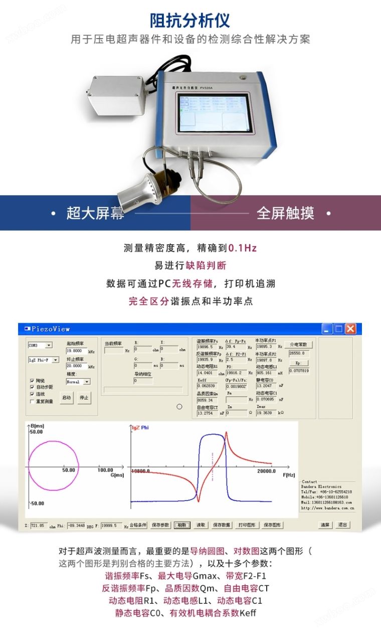 超声元件分析仪PV520A 系列产品是由声学所研制开发的,用于压电超声器件和设备的检测综合性解决方案。PV520A 是在PV70A-P(电脑版)和PV70A-D(自带显示版)基础上,结合了前二者的优点开发的全新一代超声元件分析仪。 阻抗分析仪 一、超声元件分析仪 PV520A 超声元件分析仪PV520A 系列产品是由声学所研制开发的,用于压电超声器件和设备的检测综合性解决方案。 PV520A 是在PV70A-P(电脑版)和PV70A-D(自带显示版)基础上,结合了前二者的优点开发的全新一代超声元件分析仪。其特点如下: ①大屏幕、全屏触摸,使得PV520A 既有PV70A-P(电脑版)的操作体验感,又没有带电脑操作的累赘感。 ② 依靠全新的ARM 处理器数据处理能力,PV520A 的测量精确度远高于PV70A-D(自带显示版),可以达到PV70A-P(电脑版)的水平。 ③ 全屏触摸操作更人性化,不再需要PV70A-D(自带显示版)的大量物理按钮,因而操作仪器变得极为简单,同时产品尺寸更小,重量更轻,便携性更好。 ④ 可以像PV70A-P 连接电脑进行操作,且软件完全兼容,用户无需再熟悉软件操作。 二、产品详情