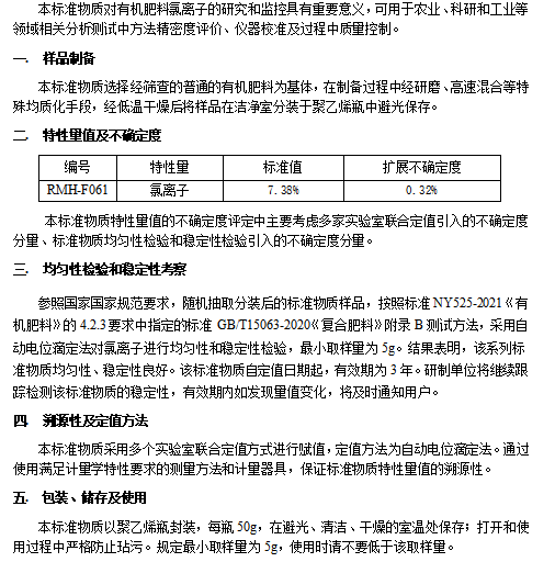 有机肥料中氯离子成分分析标准物质