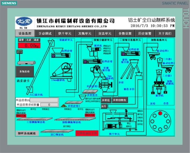全自动制样机实现从来样称重、读卡、制样、装瓶、封口、IC卡写码等全过程自动化,可实现在线、离线等不同方式。 主要特点 1、样品装瓶后对其进行IC卡二次加密写卡操作,瓶体及IC卡可多次重复使用,降低了用户使用成本。。 2、设有弃样暂存装置,确认制样装瓶结束后弃样返回。 3、采用上位工控机+西门子PLC1200可编程控制器+触摸屏控制,可以对样品制备过程中各个样品的在制流程进行监控。 4、配有远程通讯接口,可以和用户的控制系统对接,同时制造商也可以通过互联网对系统运行进行维护。 主要技术参数 1、来样粒度:<100mm 2、来样质量:20-100kg 3、最终样品:13或6mm水分样、3mm存查样、0.2mm分析样 4、总功率:<40kw 5、制样效率:4-8个/h 6、占地面积:50㎡ |