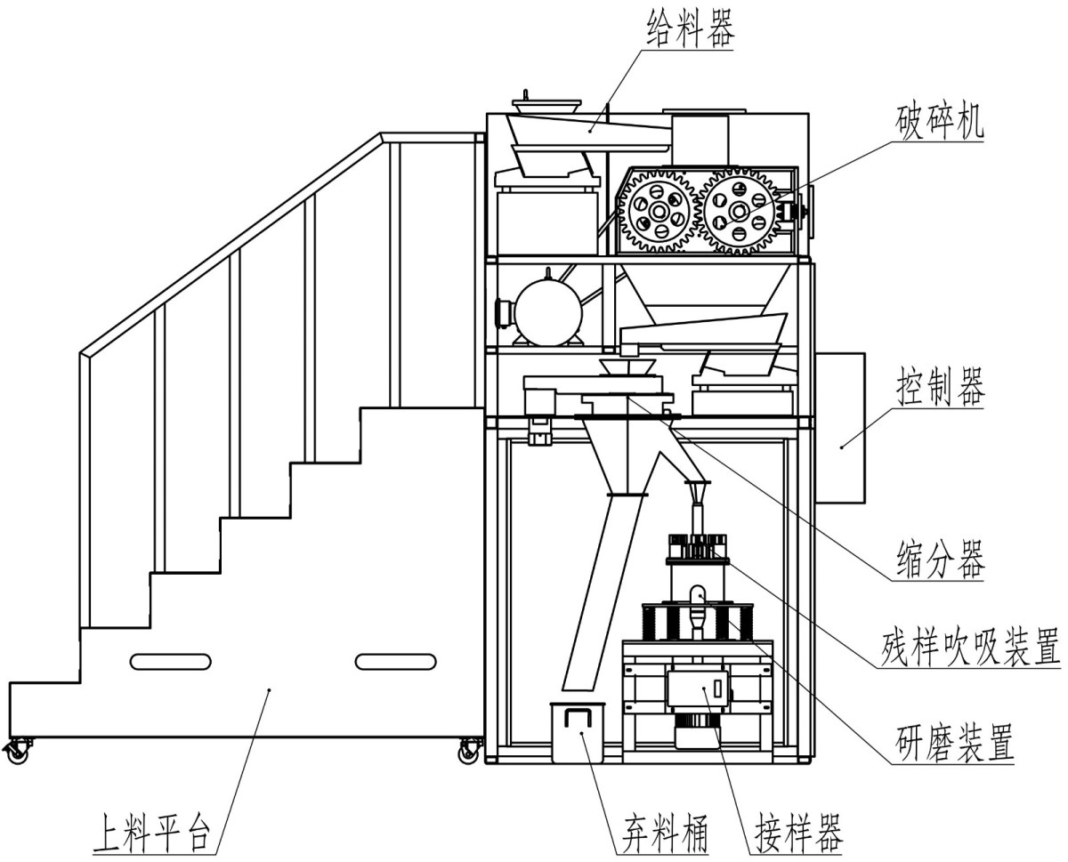 铁合金/铁矿石制样装置是用于铁合金、铁矿石样品制备的破碎缩分研磨一体化装置。主要由给料单元、破碎单元、缩分单元、研磨单元、残样吹扫单元、控制单元及除尘器等组成。 主要特点 1、采用西门子PLC控制技术,大尺寸智能触摸屏操作。 2、给料单元能够均匀供料,有效防堵,保证破碎机正常运行。 3、破碎单元采用大直径对辊破碎机,破碎效率高;轧辊表面合金熔覆,耐磨耐用。 3、缩分单元采用旋转斜管-漏斗型经典缩分方式,缩分精度高,缩分比调节方便。 4、研磨单元能连续供料,定时研磨自动出料。 5、残样吹扫吸除装置在制样流程结束后自动吹吸,确保无样品残留,避免交叉污染。 6、设有多个观察窗和检修门,方便日常使用、维护、检修及清扫。 7、全密封设计,配备除尘器,无粉尘泄露,符合环保要求。 主要技术参数 给料粒度:≤20mm 出料粒度:120-200目 缩分比:1/10(可调) 重量:约1300kg 外形尺寸:3200×840×2650mm (含上料平台) |