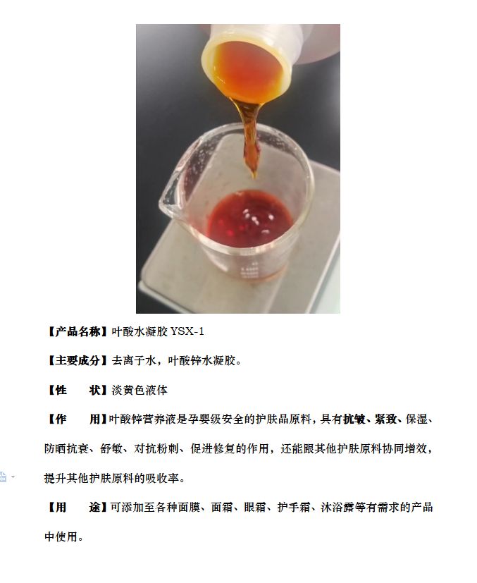 产品特点: 叶酸锌营养液是北大研发的一款新型的活性护肤原料,叶酸对DNA合成、细胞新陈代谢等生理过程具有极强的促进作用,可促进DNA断链再次结合,从而有效修复因紫外线造成的皮肤损伤。 · 孕婴级日化原料更加温和 安全 ·具有抗皱紧致、吸收紫外线,细胞划痕修复等功效 ·性状稳定,配伍性好,配方稳定性高
