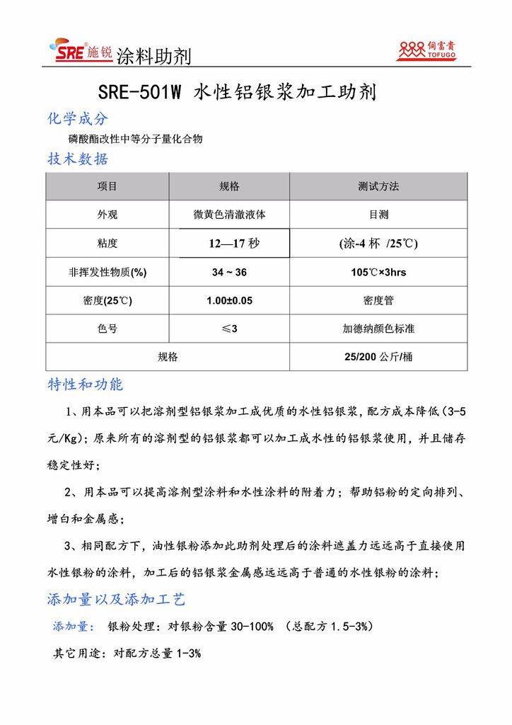 SRE-501W 水性铝银浆加工助剂 化学成分 磷酸酯改性中等分子量化合物 技术数据