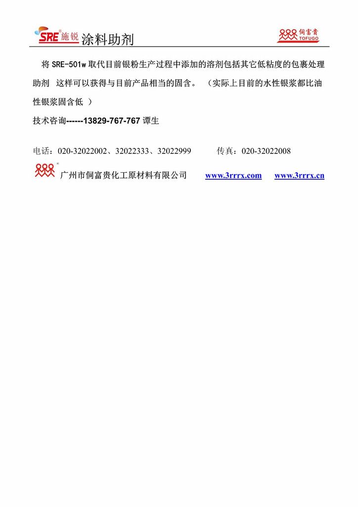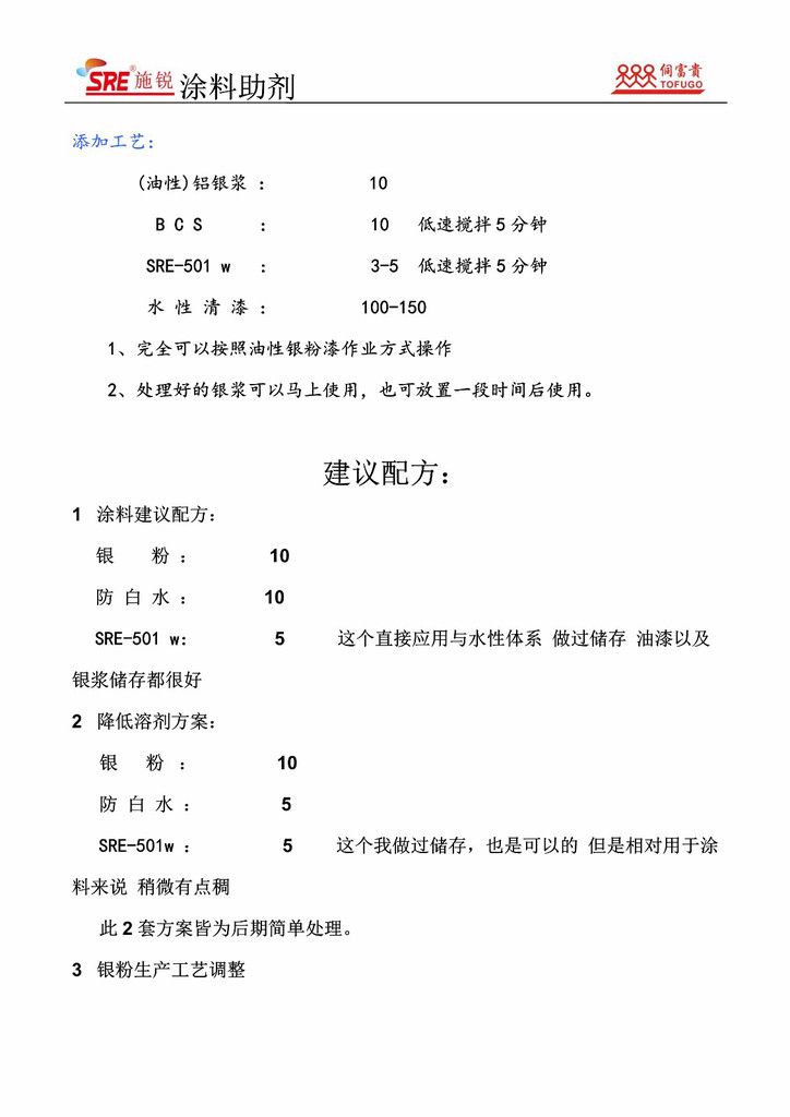 建议配方: 1 涂料建议配方: 银 粉 : 10 防 白 水 : 10 SRE-501 w: 5 这个直接应用与水性体系 做过储存 油漆以及银浆储存都很好 2 降低溶剂方案: 银 粉 : 10 防 白 水 : 5 SRE-501w : 5 这个我做过储存,也是可以的 但是相对用于涂料来说 稍微有点稠 此2套方案皆为后期简单处理。 3 银粉生产工艺调整 将SRE-501w取代目前银粉生产过程中添加的溶剂包括其它低粘度的包裹处理助剂 这样可以获得与目前产品相当的固含。 (实际上目前的水性银浆都比油性银浆固含低 )