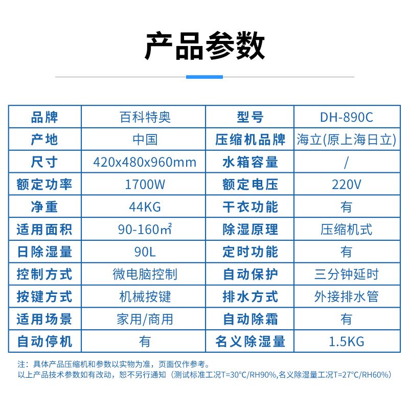 百科特奥90升除湿机DH-890C技术参数参数 产品实拍品 牌 百科特奥 除湿量 90升/天电 源 220V/50HZ 输入电流 6.8A 输入功率 1700W 环境温度 5-38℃ 循环风量 900立方米/小时 适用范围 90-130平方米/层高3米 排水方式 软管直排 除霜方式 自动 体 积 420x480x960mm 重 量 55kg 自动保护 三分钟延时保护 控制方式 全湿度显示,液晶显示控制除湿,自动化霜 说明:除湿量是在标准环境条件下测定的,如上 DH-890C除湿量标90升/天, 就是指在30℃/RH80%的环境下24小时测定的出水容积.移动方式 万向轮。除湿机通过制造低压环境和压缩制冷的方式,能够将空气中的湿气去除,使其保持干燥状态。抽湿机广泛应用于潮湿的环境中,能够提高环境的质量,保护人体健康。在使用抽湿机时,需要注意一些使用细节和保养情况,延长机器的使用寿命。 ![]()