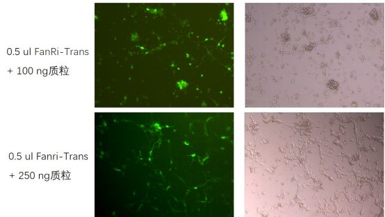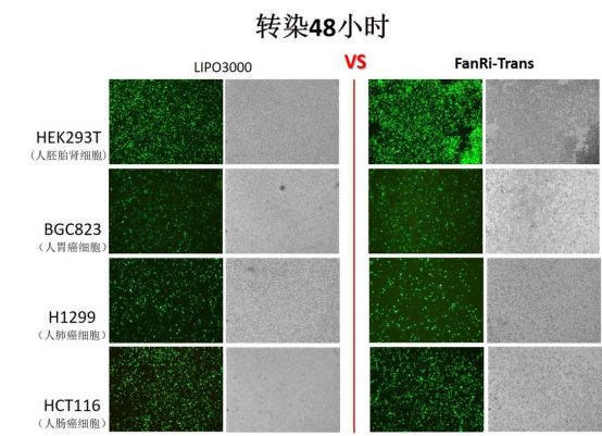 5:ce与LIPO 3000过表达细胞效果比较,FanRi-Trans转染效果明显优于LIPO 3000 结论 FanRi-Trans是采用先进的纳米合成技术研发的一款高效试剂,具有以下优点: 1. 对于难转的细胞系,原代细胞具有良好的过表达效率。 2. 转染操作过程简便,只需将试剂与小片段RNA或质粒按比例直接混匀,孵育15分钟即可加到含血清的培养基中,且转染后无需换液。 3. 具有生物相容性,生物可降解性,低毒性。 4. 转染过程可兼容血清和抗生素。 5. 适合于RNA, DNA及其共转染。