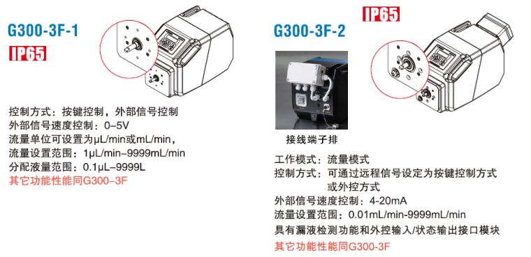 兰格公司根据客户的具体需求,提供定制化的工业蠕动泵解决方案。G300-3F-1和G300-3F-2都是以G300-3F为基础的定制化产品,可以配合使用市场上常用的工业蠕动泵泵头,并根据需要更改工作模式、外控功能、增加泵头漏液检测功能等。