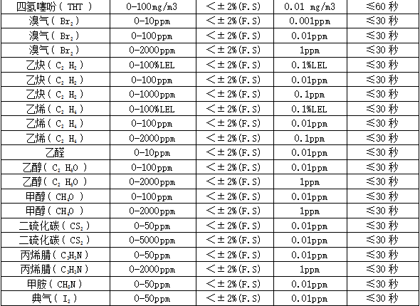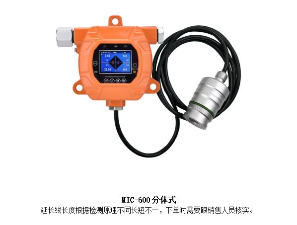MIC-600固定式检测仪技术参数: 检测气体:C2H4O 选配:最多可同时检测任意1~6种气体和温湿度。 应用场合:石油、化工、医药、环保、燃气配送、仓储、烟气分析、空气治理等所有需要固定安装,在线检测气体浓度的场合。 检测范围:0-1.00、3.00%Vol、50%Vol 分 辨 率:0.01ppm或0.001ppm(0~10 ppm);0.01ppm(0~100 ppm),0.1ppm(0~1000 ppm),1ppm(0~1000 ppm以上),0.01毫克/升(0~200%毫克/升)、0.1%LEL、0.01%、0.001%Vol。 检测原理:红外,高精度,10年 允许误差:≤±2%F.S (其他或更高精度可订制) 线 性 度:≤±1% 响应时间:T90≤30秒重 复 性:≤±1%不确定度:≤±1% 信号输出:总线制RS485(RTU),三(四)线制4~20mA,选配:0~20mA、1~5V、0~5V、0~10V、无线传输、网络传输、短信报警。恢复时间:≤30秒 工作环境:温度:-40℃~+70℃,湿度:≤10~95%RH (常规)非凝露场合,在凝露场合使用须订制或订货时注明使用环境。工作压力范围:大气压±30%,部分传感器可在7公斤压力下检测 显示方式:现场2.5寸高清彩屏显示,可选现场无显示,或选配MIC2000控制器远程显示、控制、报警 工作电压:12~36VDC直流,单台设备的标准电源为24V,1A或大于1A 的直流稳压开关电源 功 耗:瞬间最大电流:电化学原理60毫安,催化或红外原理120毫安 电源参考:24V,2.1A 的开关电源可以带动30台有毒气体检测仪,或15台可燃、红外气体检测仪 工作方式:在线式安装,在线检测,扩散式测量;可选管道式、流通式、泵吸式测量。 安装方式:管道式、壁挂式。管道式的工作压力为大气压±30%,超出范围需降压处理。 报警方式:默认1路,可选3路无源触点(干节点)输出,三级报警,报警点可设置。现场声光报警(选配)。 连接电缆:4~20mA选三芯屏蔽电缆,RS485选四芯,距离超1000米时 单根线径≥1.5mm;屏蔽层两端接大地并保证接地良好。 防护等级:IP66 防水溅和短时间雨淋 防爆类型:隔爆型 防爆标志:Exd IIC T6 Gb 防爆证号:CNEx17.3959 执行标准:GB15322.1-2019 《可燃气体探测器 第1部分》 GB 3836.1—2010 《爆炸性气体环境用电气设备 通用要求》 GB 3836.2—2010 《爆炸性气体环境用电气设备 隔爆型“d”》 外型尺寸:260×180×90mm(L×H×W)大气室 260×230×90mm(L×H×W)大气室带灯 240×180×90mm(L×H×W)常规气室 240×230×90mm(L×H×W)常规带灯 (根据组合不同略有差异) 重 量:1.8Kg(根据组合不同略有差异) 标准附件:说明书、合格证、保修卡、外箱包装 选配件:一体式声光报警器、分体式声光报警器、24V直流稳压电源、RS485/RS232转换器、USB/RS232 转换连接线、TCP/IP转换器、 无线传输(选配):选配功能,可以把数据无线传输到手机、远程监控中心、监控电脑等监控设备,利用上位机在电脑上,进行数据分析、存储、打印等功能 预处理系统(选配):选配:常温高湿预处理系统、高温高湿度预处理系统、高温高湿高粉尘预处理系统 温湿度测量(选配):选配:温度-40℃~+120℃,精度0.3℃湿度:0-100%RH,精度3%RH 安装型附件:选配:墙壁安装支架、固定在管道上的安装卡扣(四分、六分管)、管道安装不锈钢螺纹焊座或法兰(需注明管道或法兰尺寸,如DN50、DN15...)、防雨罩、24VDC或220AC采样泵(采样距离10米)、真空泵(采样距离40米)、24V开关电源、减压阀、流量计。 部分可检测气体列表: