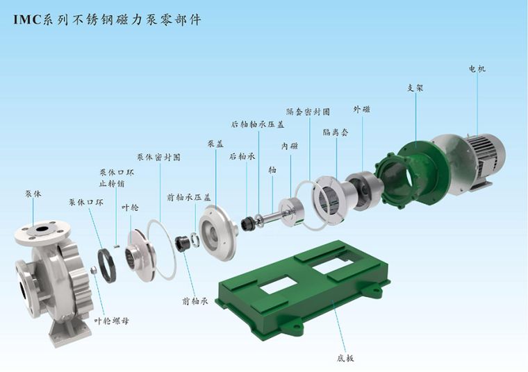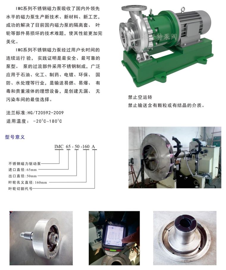 IMC系列不锈钢磁力泵吸收了国内外**水平的磁力泵生产新技术、新材料、新工艺,成功的解决了目前国内磁力泵的隔离套、 叶轮等部件易损坏的技术难题,使其性能更加**化