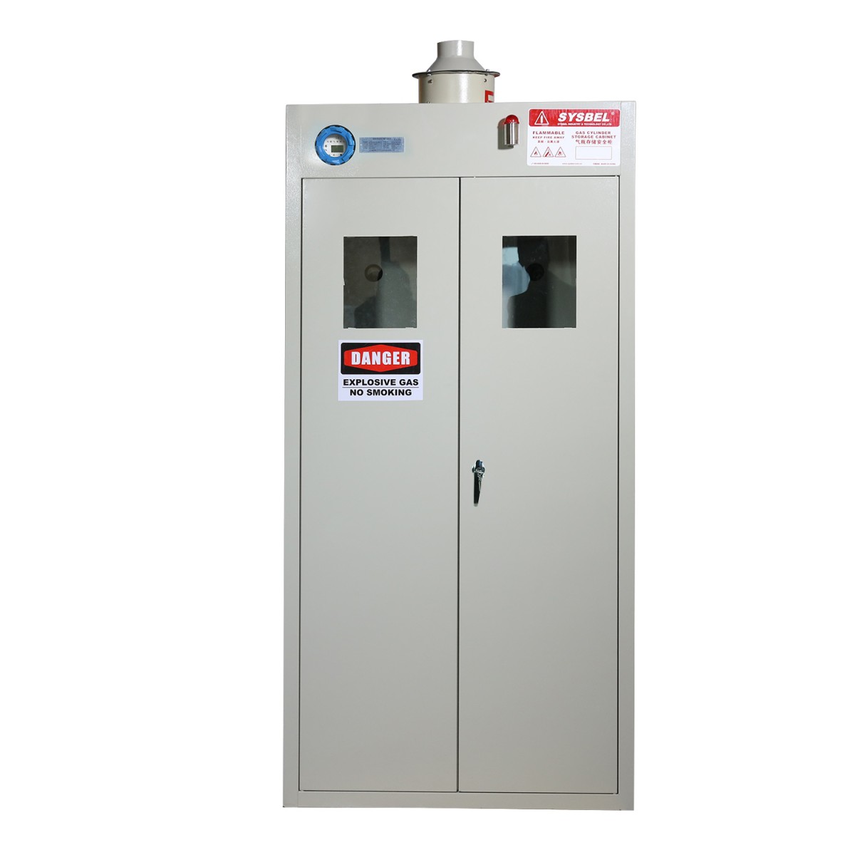 1.柜体采用1.2mm厚优质镀锌钢板,表面环氧树脂静电喷涂, 达到防酸碱及防锈之效果; 2.门板上设置透明观察视窗,安全且便于观察品类管理 3.柜体侧面设有PASS孔,保证柜内空气流动; 4.柜内采用加厚帆布扎带固定气瓶,防止气瓶倾倒; 5.柜体底部设有可翻转踏板,方便气瓶推车装卸,操作省力; 6.标配防爆点型可燃气体探测器,可识别大多数可燃气体。采用进口原装传感器,具有线性好、寿 命长、稳定性好的特点,可实时显示探测气体的当前浓度值响应时间小于30s预热时间60s。 7.标配防爆声光报警装置,当柜内传感器检测到气体泄漏时,会自动触发红灯闪烁和发出报警轰鸣声; 8.传感器检测到气体泄漏并报警的同时,顶部标配的防爆轴流风机自动工作,通过排风管或者中央 排风系统将泄漏气体排出室外,保证工作区域的人身安全,争取救援转移时间; 9.智能防爆气瓶柜除了可存储40L标准气瓶,通过选配加装的气瓶支架可兼容10L、8L、4L等标准气瓶; 10.防爆标志:EX d ib IIB T4 Gb; 11.工作电压:AC 220V/50Hz; 12.防爆轴流风机风量:1500 m3/ h。