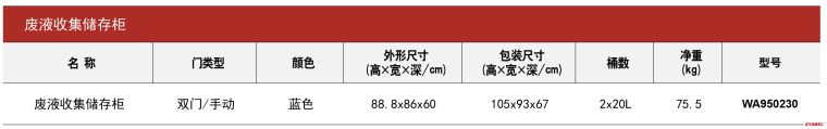 1.柜体为双层钢结构,符合FM标准要求、符合美国美国职业安全健康管理局OSHA 29 CFR 1910.106 及美国国家消防协会NFPA CODE 30 规范。 2.柜体设置两处通风装置,有效降低挥发性物质浓度,预防火灾产生(亦可选配自动灭火装置)。 3.表面环氧树脂粉末涂料处理,光亮、防尘、防锈和防腐。 4.柜门三点联动锁,减少摩擦或机械火花,降低静电积蓄。 5.可配安全挂锁,实现双人双锁管理,符合中国《危险化学品安全管理条例》的规定。 6.底部配备聚乙烯实验室托盘,有效预防液体泄漏,符合盛漏规范。 7.标配西斯贝尔20L HDPE废液桶,有效储存、转运废液。 8.标配电池液位报警器,自带电源,当废液达到设定值时,会产生声光报警提示。 9.顶部两侧配备PP杯槽,能有效收集废液并避免腐蚀,中间配备PE托盘,用于存放小型防护产品。 10.底部配备刹车万向轮,保证设备移动方便,右侧配备拉手,方便移动运输。 11.顶部张贴化学品相容性表,参考此表可有效避免不相容化学品混合造成的危害。 12.可选配 FM 认证的防静电装置。