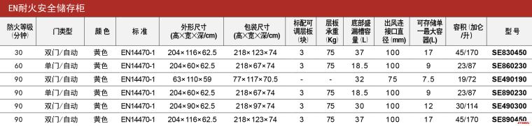1.柜体采用高强度的钢板制作,表面静电喷涂耐腐蚀的橘纹塑粉;柜体隔层内为多层防火隔热材料,以达到防火的目的。 2.正常使用时,柜门可手动打开或关闭,柜门带有阻尼器,调节开关门力的大小;当环境温度达到122℉(50℃),内置的熔丝会断开,敞 开的柜门会自动关闭,以保护柜内物品。 3.当环境温度达到158℉(70℃),通风系统中的通风孔挡板会自动关闭;通风系统可外接排气管道或者空气过滤器。 4.在火灾发生时,门缝及所有连接处备有的特殊感热材料会自动膨胀填满缝隙,以保证柜体内部处于密封状态。 5.每扇门上有独立的圆柱锁;门上的反光警告标签符合ISO 3864规定,在低能见度及电筒照射下都十分醒目。 6.可拆卸的底部盛漏槽,与带孔的嵌件配合使用,即可盛接柜内的漏液,又可避免孔嵌件上的物品浸泡在漏夜中。 7.标配3块可调钢制层板,每隔可调间距32mm,层板承重能力为75KG。层板翻边高30mm,可防止小型容器意外滑落。 8.柜体底部设有可调的调平支脚,即使在不平整表面也能使柜体保持平衡。 9.设有静电接地传导端口,方便连接静电接地导线。 10.所有耐火柜符合EN、OSHA和NFPA30标准;其中SE860230、SE830450和SE890450通过TÜV独立耐火测试并获得TÜV认证。 11.可选配专用挂锁,实现双人双锁管理,符合中国《危险化学品安全管理条例》的规定。