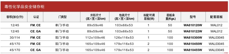 产品功能:柜体采用GA/T 73-2015机械防盗锁具,双锁管控设计,提高了设备的安全性,有效的做到了危化品的管控、安全、防盗、防撞性;再加上独有的三点联动结构,使得开锁轻松方便。 由双层18 Ga(1-.2mm)钢板通过点焊接构造,两层之间相隔38mm的形成良好的防火绝缘层; 左右两侧设置通风孔保持柜内空气流通,降低挥发的毒性气体浓度,可选择安装通风管道疏导有毒有害气体; 独有的防溢式层板防止意外泄漏的化学品四溢,层板可以依据用户需求任意调节,存储更多的化学品容器等,每隔6.5cm; 树脂粉末涂料处理,表面光亮,防尘,防锈和防潮; 2"(53mm)深的盛漏槽防止泄漏的液体外溢,符合盛漏规范; 连续的琴式铰链使得柜门平稳闭合开启; 醒目的标签可以在能见度较低的光线下辨识,提供了额外的安全保障