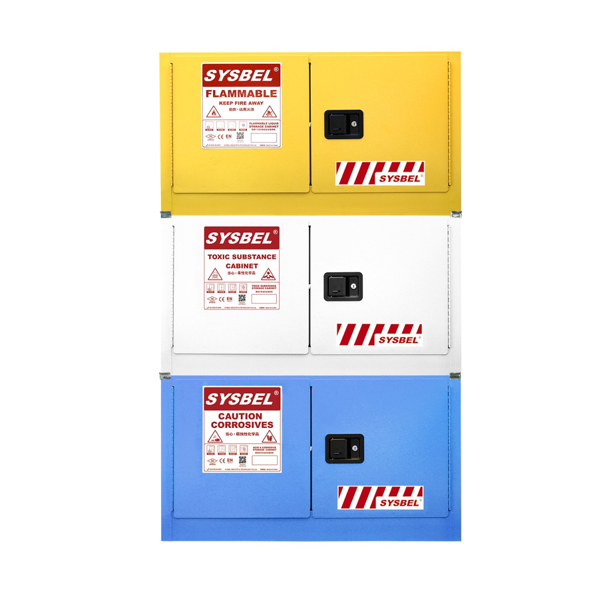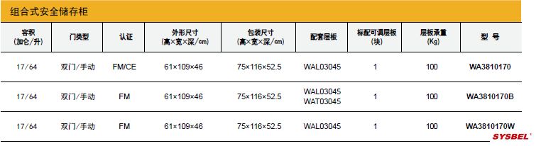 产品特点: 1.组合式安全储存柜可以解决品类多、数量少的化学品安全储存问题, 可根据实际需求单台、两台、三台叠加安装放置。 2.组合式安全储存柜有易燃液体安全柜、弱腐蚀性液体安全柜、毒性化 学品安全柜可选,解决化学品合规性储存问题; 3.组合式安全储存柜可以化学品满足多人使用,多人管理问题; 4.组合式安全储存柜结构优化设计,通过加装WAB004安全柜叠加支架, 可确保组合叠加之后不会出现意外滑落的风险; 5.组合式安全储存柜具有FM认证, 符合OSHS NFPA标准规定,为化学品 储存提供安全防护保障。