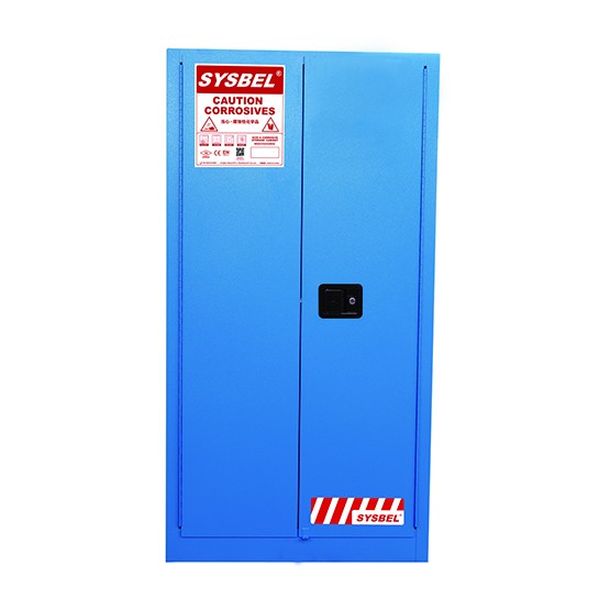 标配的PVC托盘防止泄漏的弱腐蚀性液体腐蚀柜体; 由双层18 Ga(1.2-mm)钢板通过点焊接构造,两层之间相隔38mm的形成良好的防火绝缘层; 左右两侧设置通风装置有效降低挥发性物质浓度,预防火灾产生; 独有的防溢式层板防止意外泄漏的化学品四溢,层板可以依据用户需求任意调节,存储更多的化学品容器等,每隔6.5cm; SYSTEX内嵌式三点联动锁减少摩擦或机械火花,降低静电积蓄; 安全挂锁配置(选配),实现双人双锁管理,符合中国《危险化学品安全管理条例》的规定; 树脂粉末涂料处理,表面光亮,防尘,防锈和防潮; 2"(53mm)深的盛漏槽防止泄漏的液体外溢,符合盛漏规范; 连续的琴式铰链使得柜门平稳闭合开启; 醒目的标签可以在能见度较低的光线下辨识,提供了额外的安全保障; 细节展示